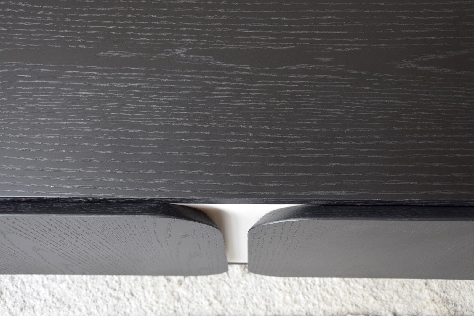 Aparador realizado en tablero de DM en roble natural teñido en negro de acabado mate con detalle central en tono gris madera mate.