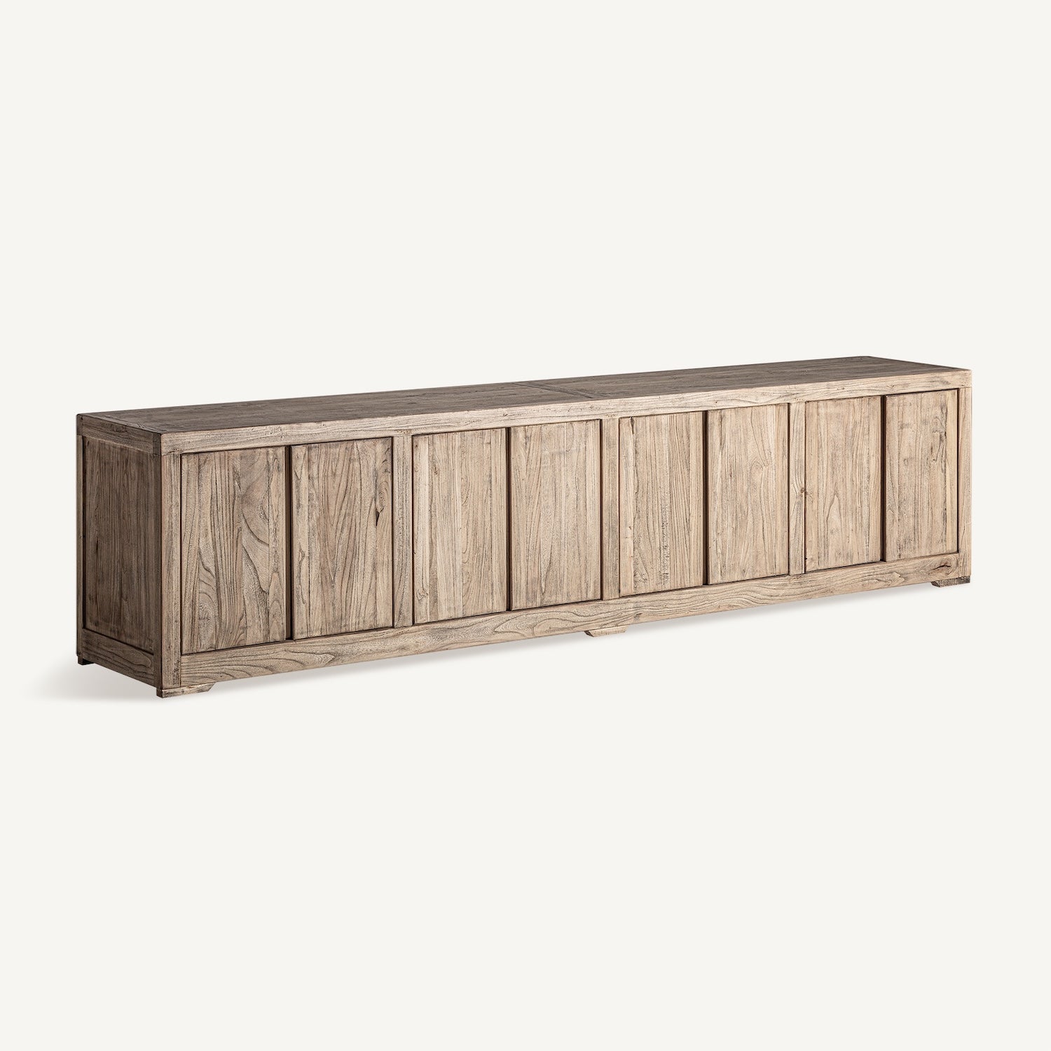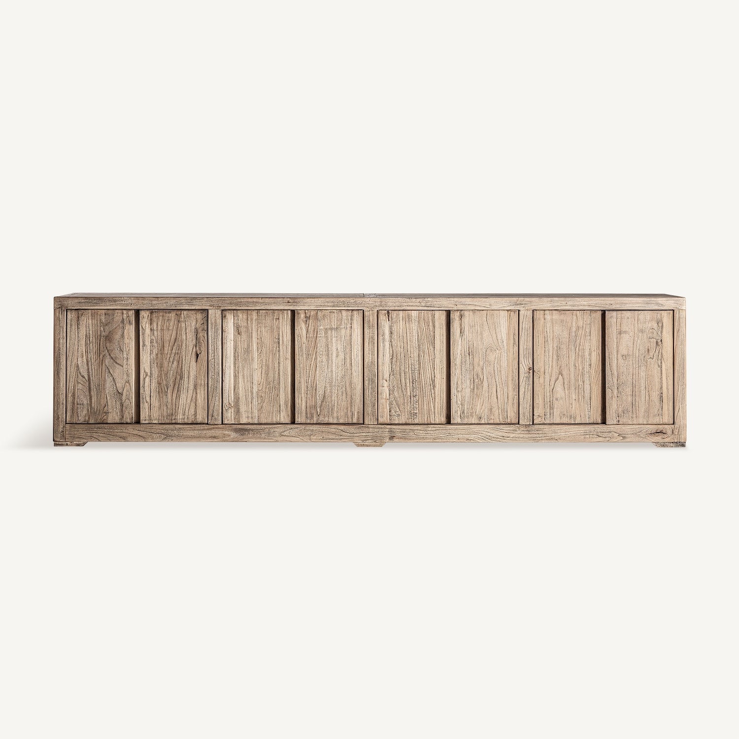 Mueble tv de estilo rústico, fabricado en madera de olmo reciclado en color marrón claro con acabado desgastado.