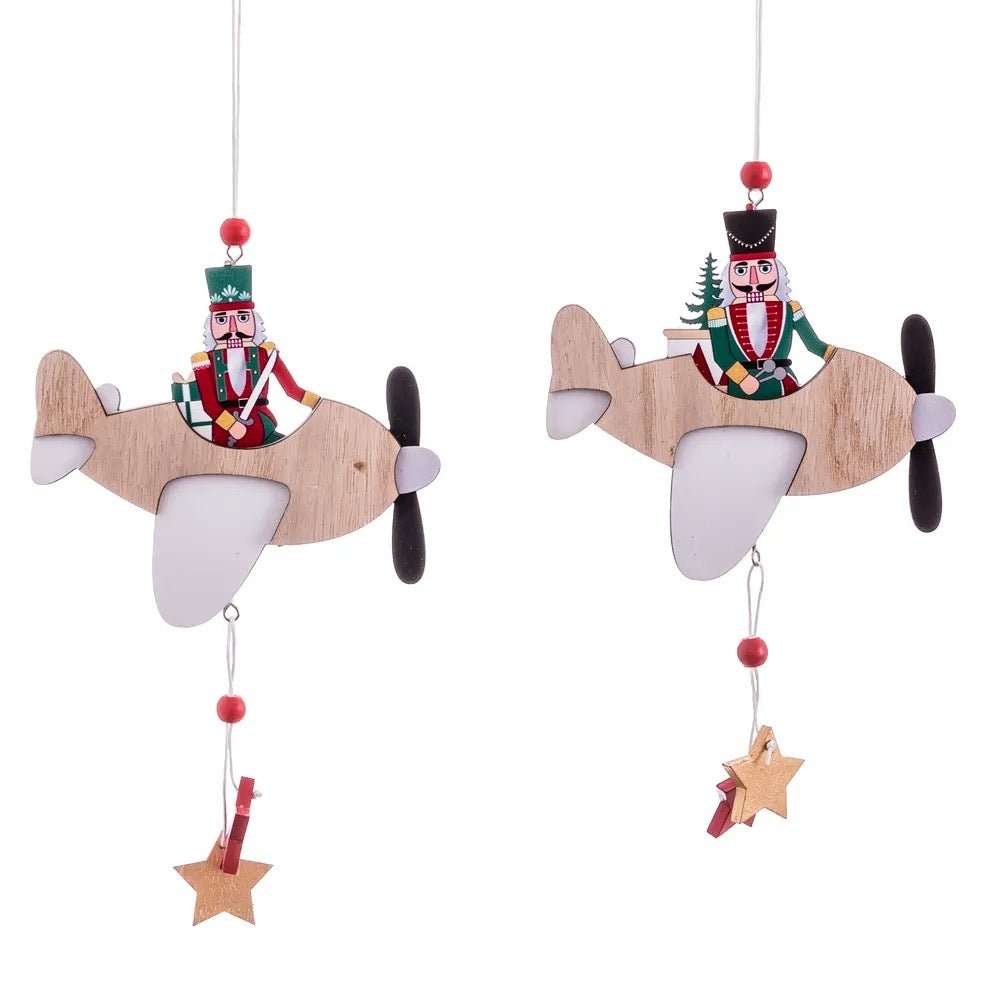 Colgante navideño con forma de avión fabricado en madera con motivo de un soldado de Navidad.