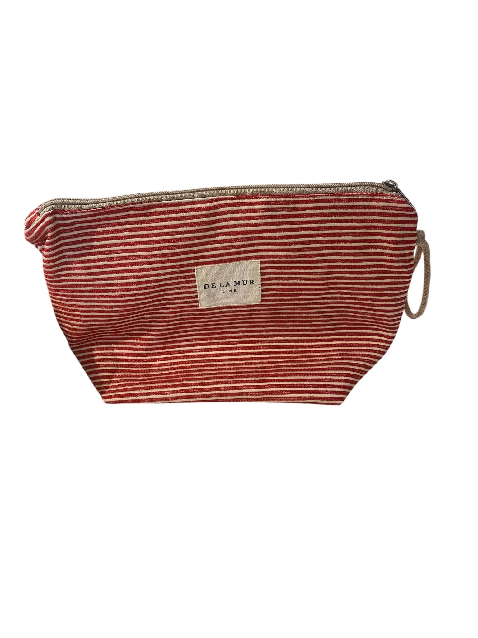 Neceser con cremallera en la parte superior y asa de cordón de color beige en el lateral. Con tejido grueso tapicero de color rojo. Forrado de tejido grueso de color gris en la parte interior. Para su correcto mantenimiento se aconseja lavarlo en frío a mano y no utilizar secadora.