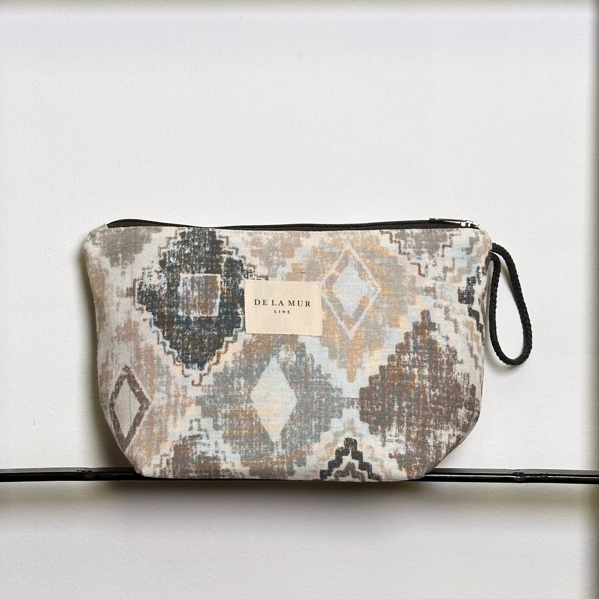 Neceser con cremallera en la parte superior y asa de cordón de tonos beige. Con tejido fino de half-panama con estampado en tonos marones y grises. Forrado de tejido grueso de color gris en la parte interior. Para su correcto mantenimiento se aconseja lavarlo en frío a mano y no utilizar secadora.