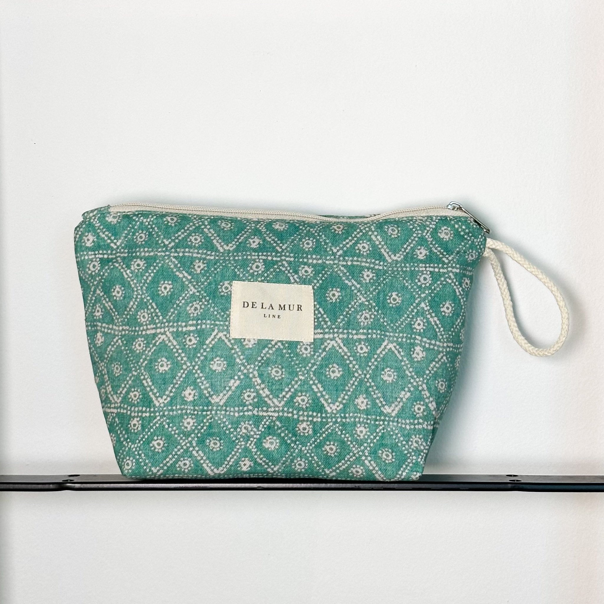 Neceser con cremallera en la parte superior y asa de cordón de color crudo en el lateral. Con tejido con estampado geométrico en color verde agua marina. Forrado de tejido grueso de color gris en la parte interior. Para su correcto mantenimiento se aconseja lavarlo en frío a mano y no utilizar secadora.