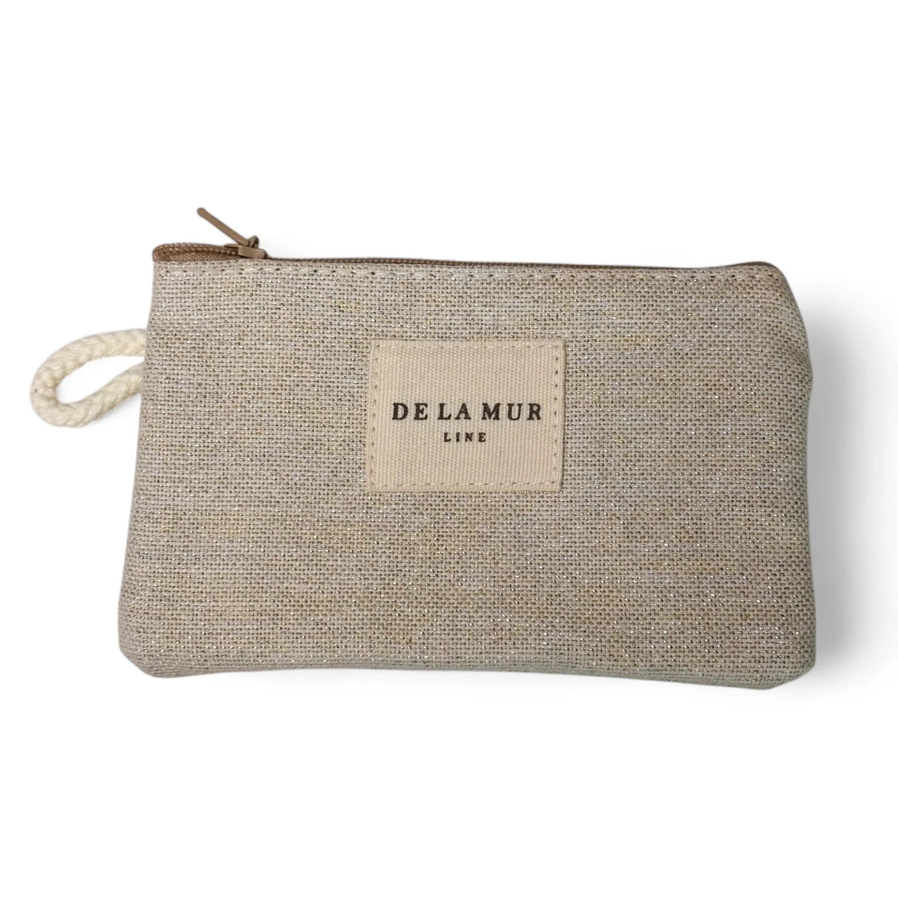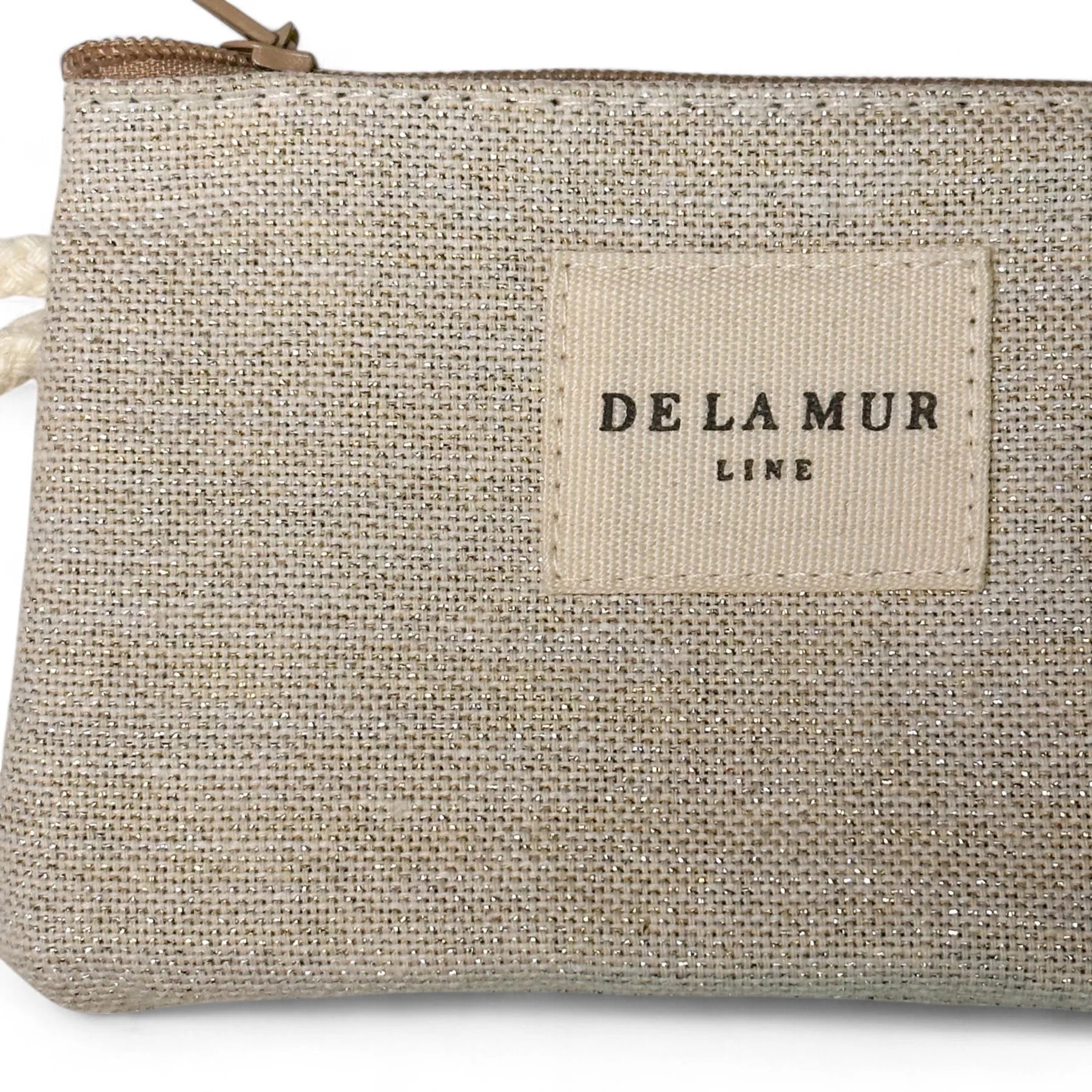 Monedero con cremallera en la parte superior y pequeña asa de cordón de color crudo en el lateral. Con tejido fino de half-panama de color beige con lurex brillante dorado y plateado. Cada articulo puede tener una variación en el estampado, dependiendo de donde se haya efectuado el corte de la pieza. Forrado de tejido grueso de color gris en la parte interior. Para su correcto mantenimiento se aconseja lavarlo en frío a mano y no utilizar secadora.