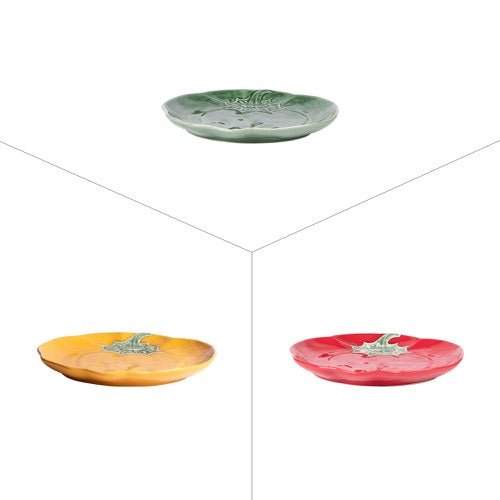 Original plato en forma de pimiento fabricado en loza en colores rojo, verde y amarillo. Disponible en dos tamaños: