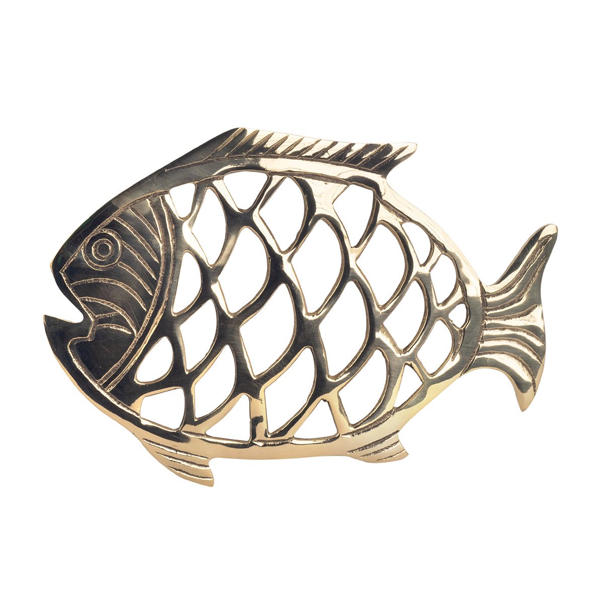 Salvamantel en forma de pez fabricada en metal colado color dorado.