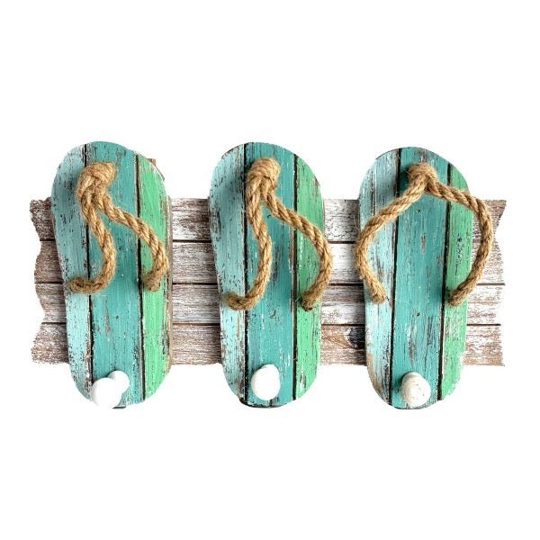 Precioso perchero con forma de chanclas fabricado en madera de abeto color natural y turquesa