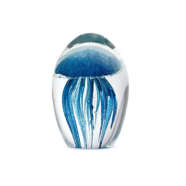 Descubre la elegancia y el misterio del océano con Medusa Eterna, un exclusivo pisapapel de vidrio artesanal. En su interior, una medusa etérea parece flotar en suspensión, capturada para siempre en un juego de luces y transparencias. Ideal para decorar escritorios, regalar o simplemente admirar, esta pieza combina arte marino y funcionalidad en un solo objeto. Cada pisapapel es único, soplado a mano con atención al detalle.