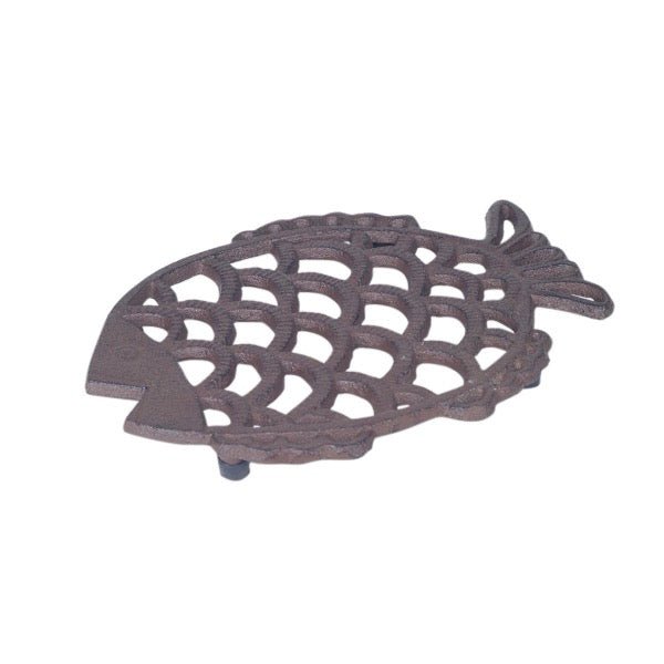 Salvamantel en forma de pez fabricado en metal colado color bronce.
