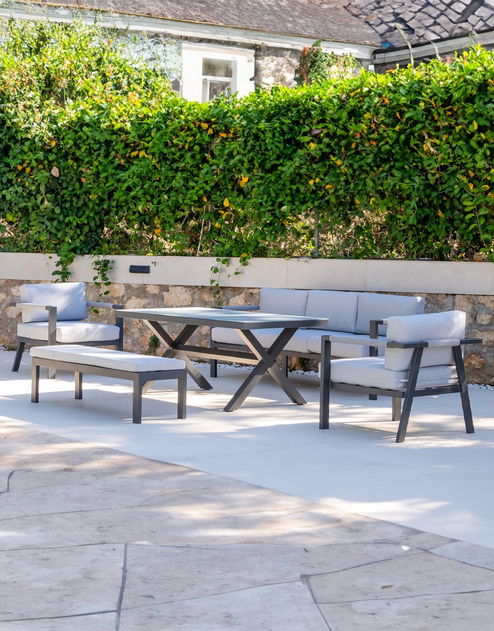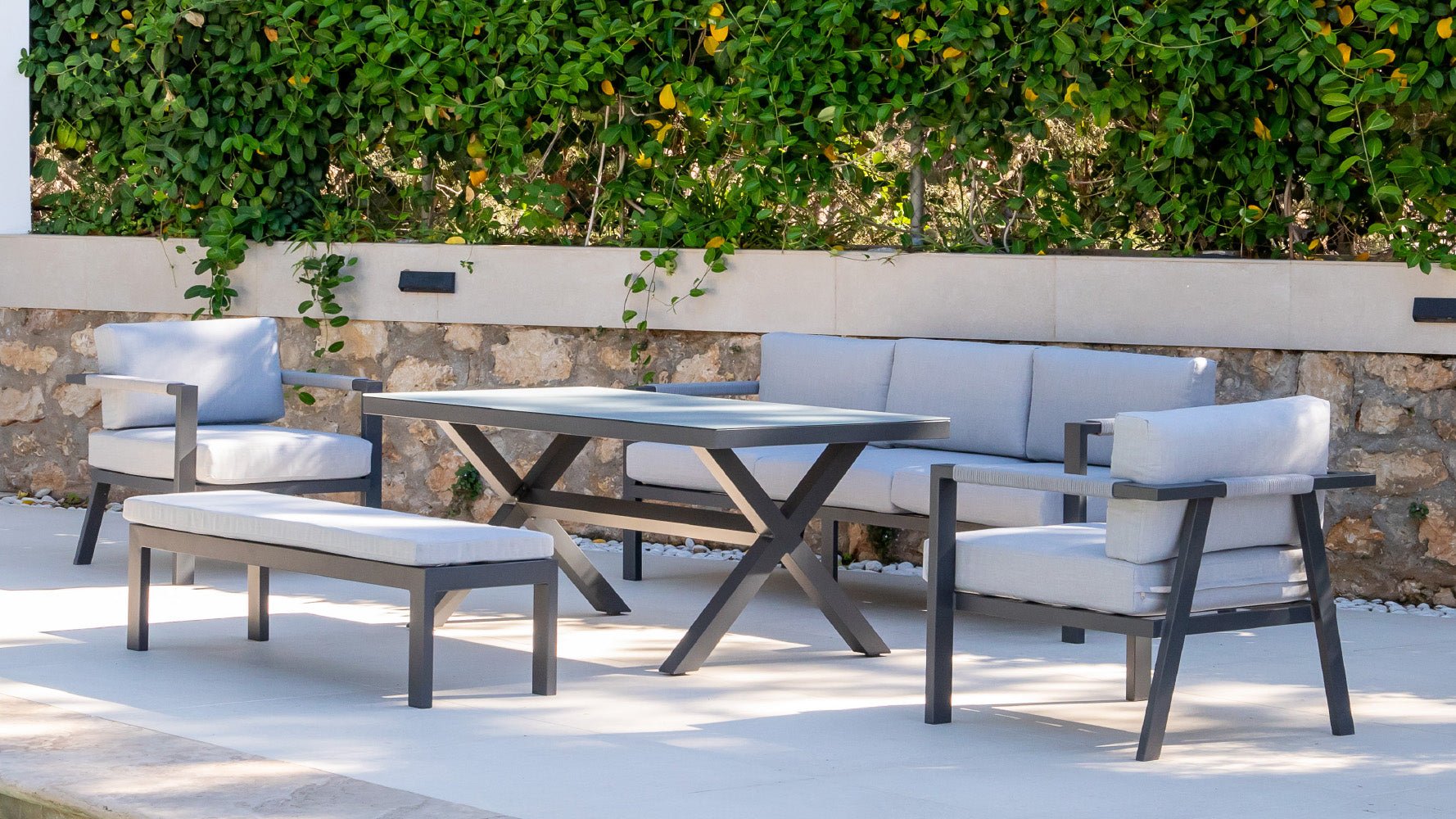 Set compuesto por sofá 3 plazas + 2 sillones + 1 mesa alta + 1 banco. Aluminio de color antracita. Cojinería de poliéster en color gris. Detalle de cuerda de poliéster gris en los reposabrazos. Mesa de aluminio con tablero de cristal gris.