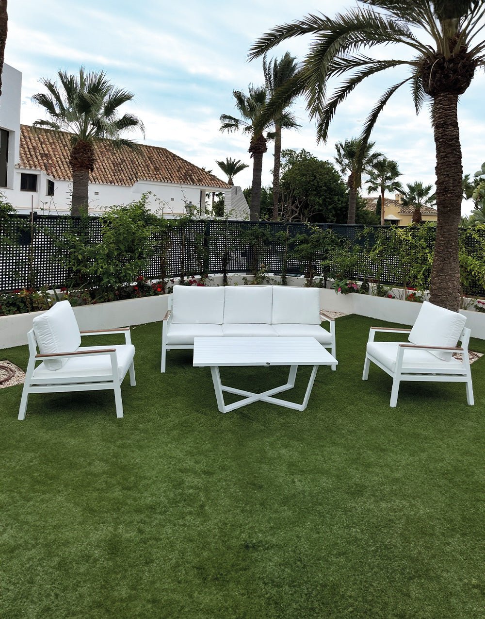 Set de aluminio blanco con detalles de resina imitación madera en el reposabrazos. Compuesto por sofá de tres plazas, dos sillones y mesa de centro. Cojines de poliéster en color blanco desenfundables.
