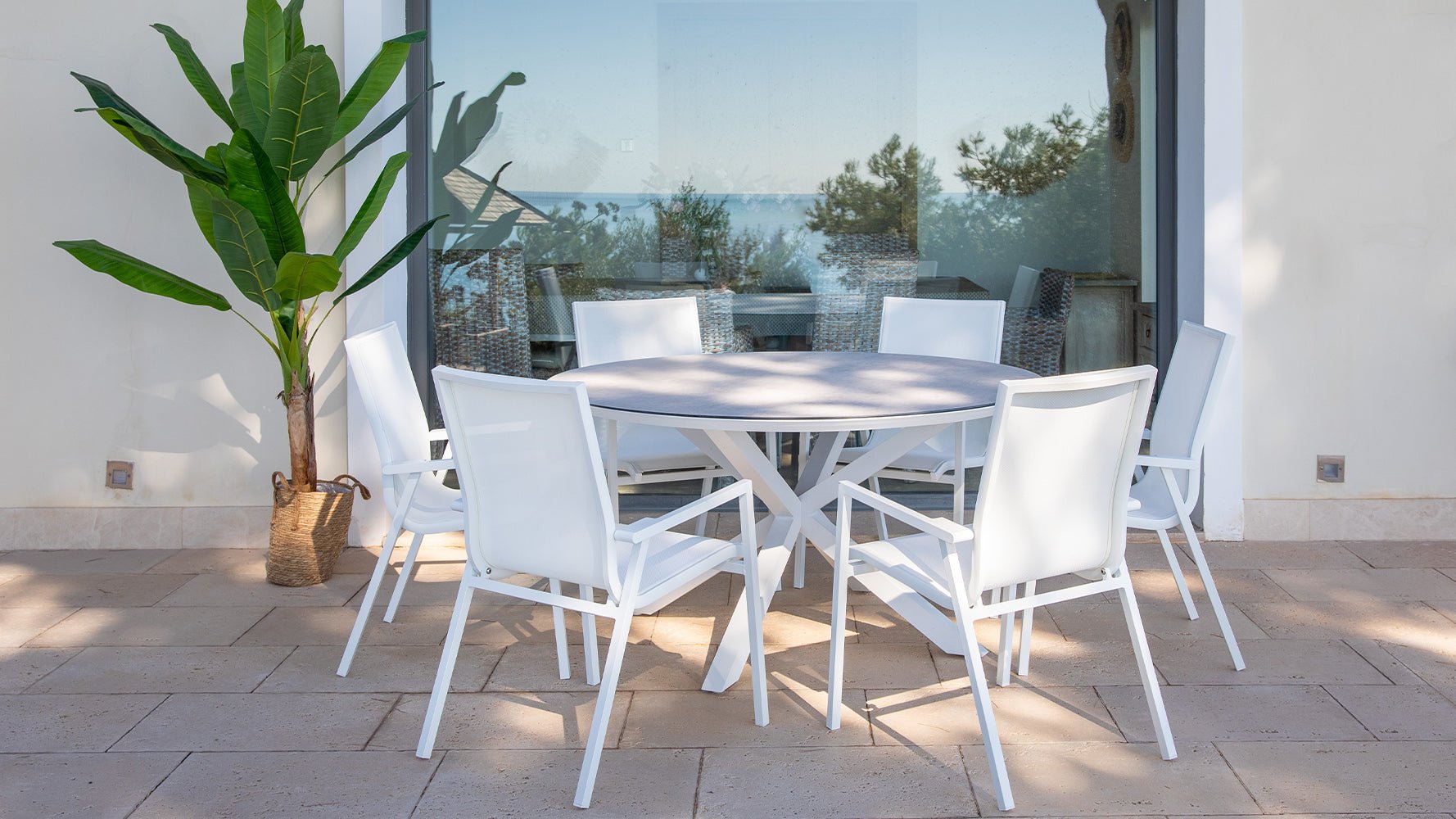 Precioso conjunto de exterior de mesa redonda + 6 sillas fabricado en aluminio color blanco, mesa con tablero de cristal cerámico imitación piedra gris y silla en poliéster color gris, apilable.
