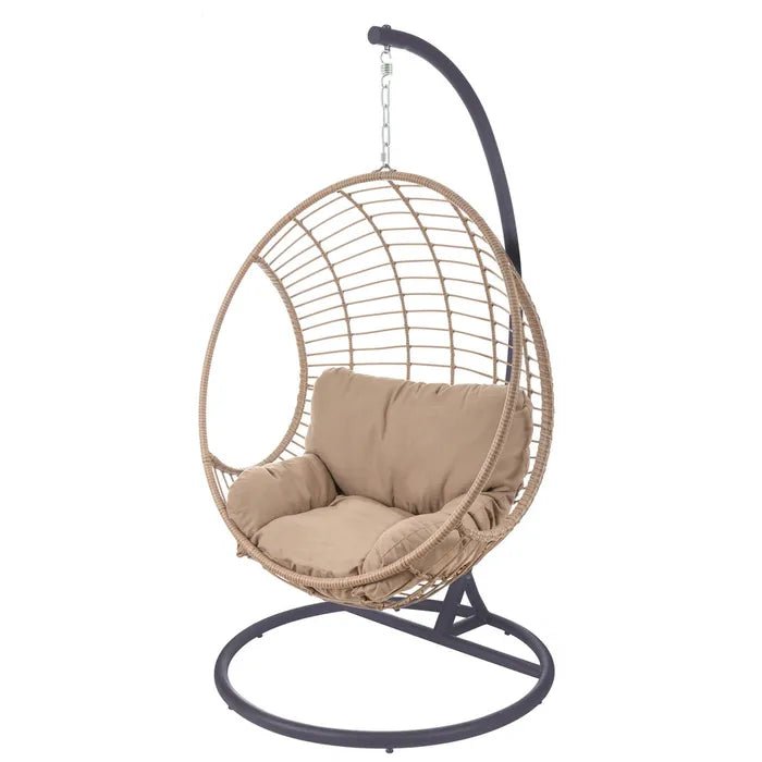 Silla colgante para exterior con estructura en acero de color negro y ratán sintético y cojín de 12 cm tapizado en poliéster en color marrón.