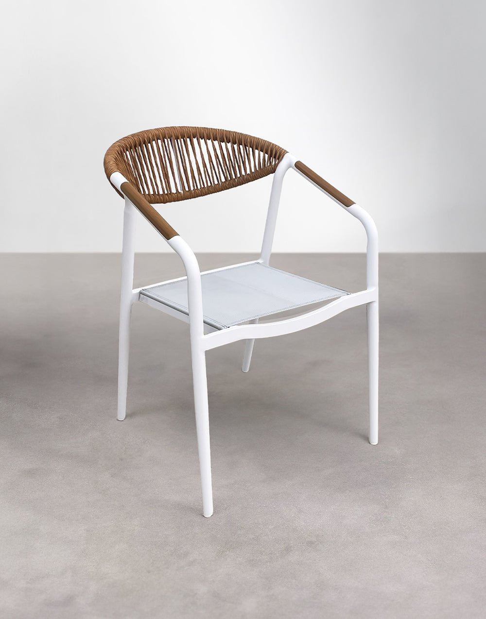Silla apilable de aluminio blanco con respaldo de fibra sintética de color natural. Asiento de textilene. Detalle de resina imitación teca en los reposabrazos.