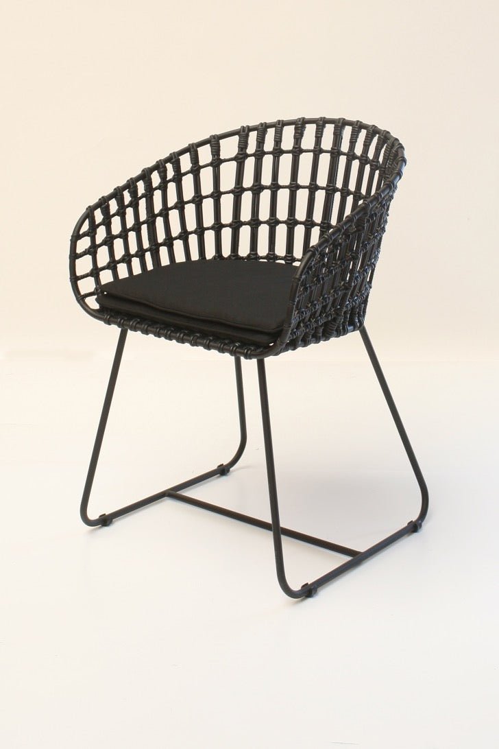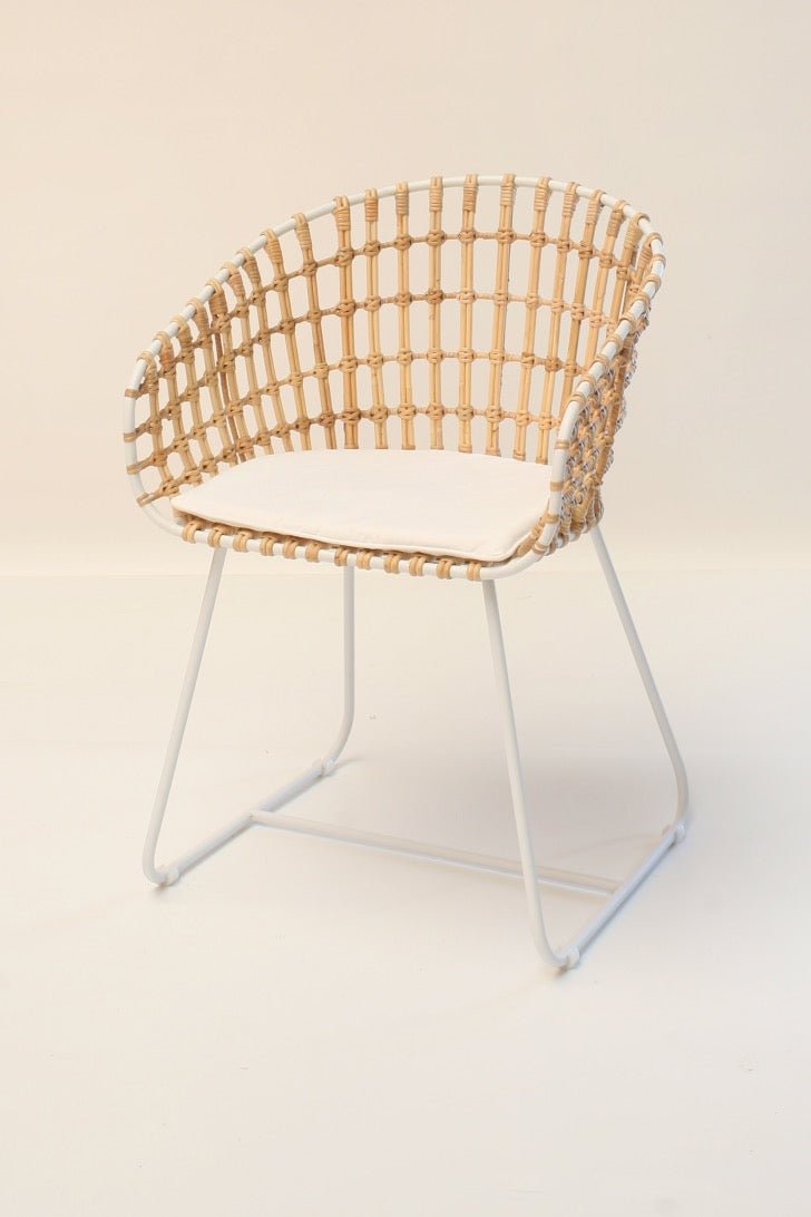 Silla serrano fabricada en ratán y metal en color negro y blanco.