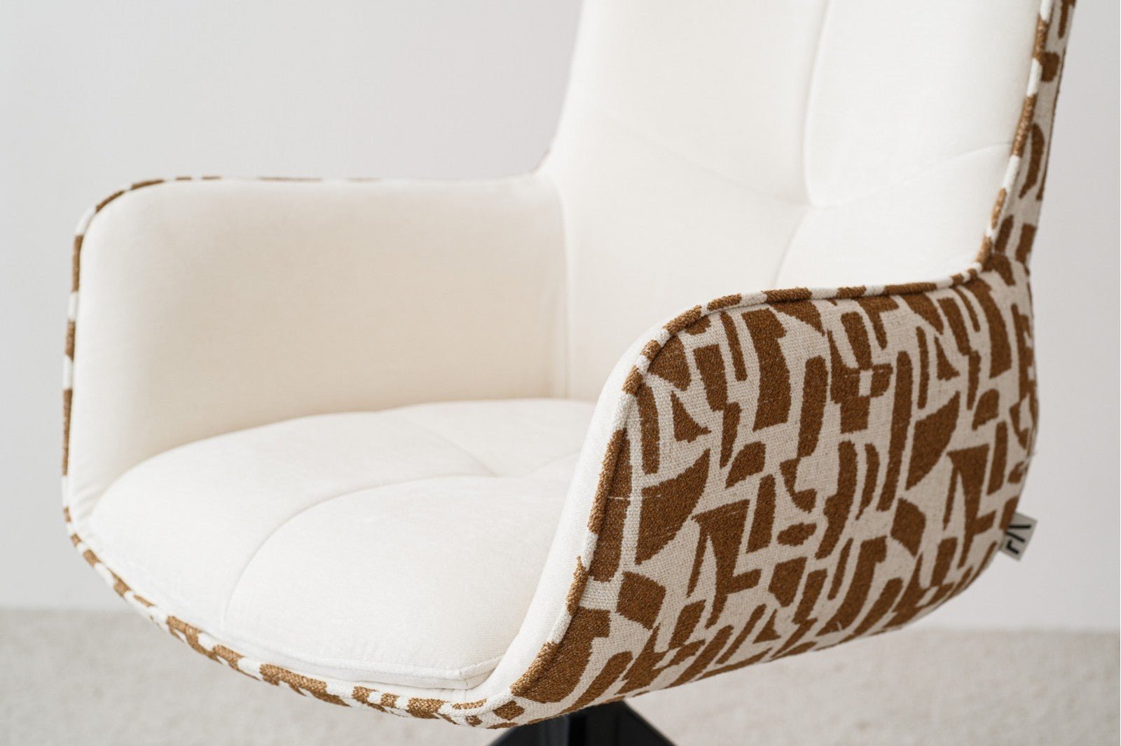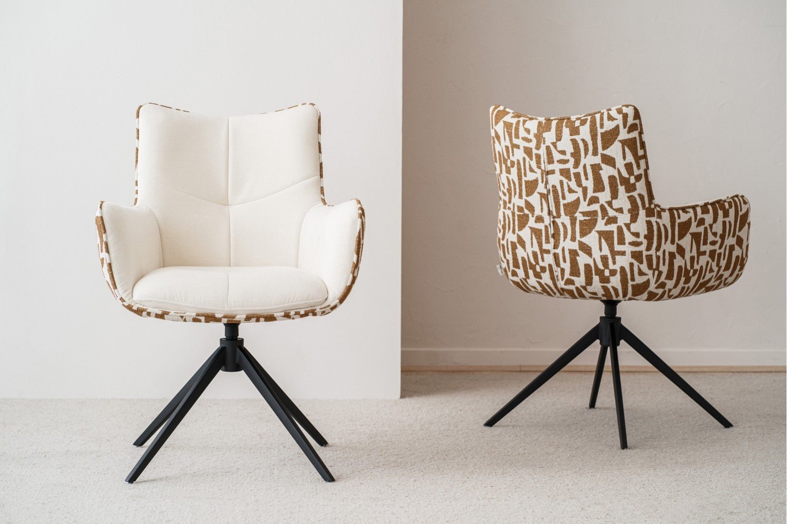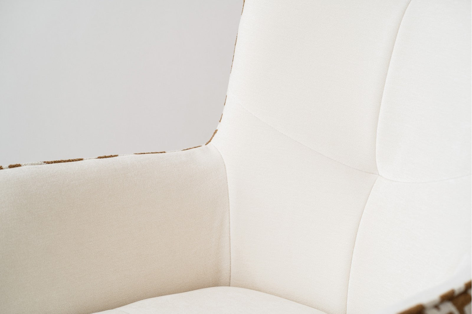 Este elegante set de dos sillas Alse de comedor combina confort y estilo contemporáneo. Su interior está tapizado con un tejido aterciopelado en tono marfil claro, que aporta suavidad y calidez al contacto. El exterior, en contraste, presenta una tela de textura más gruesa con un delicado estampado geométrico en tonos claros y ocres, ofreciendo un diseño sofisticado y moderno.