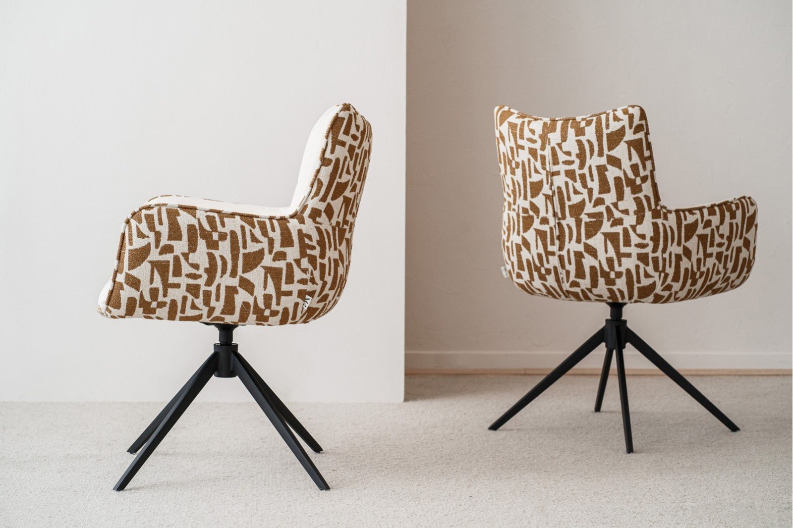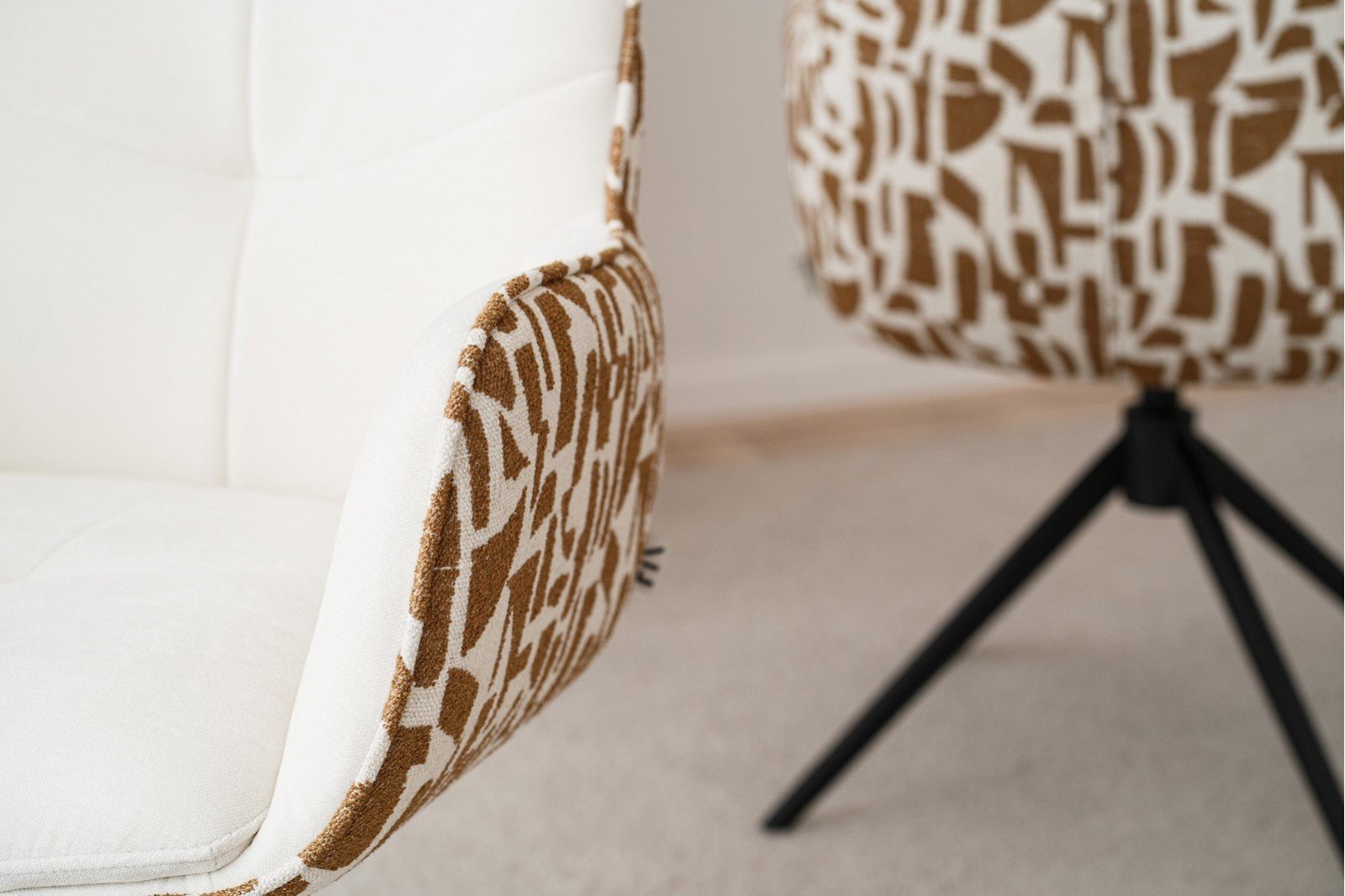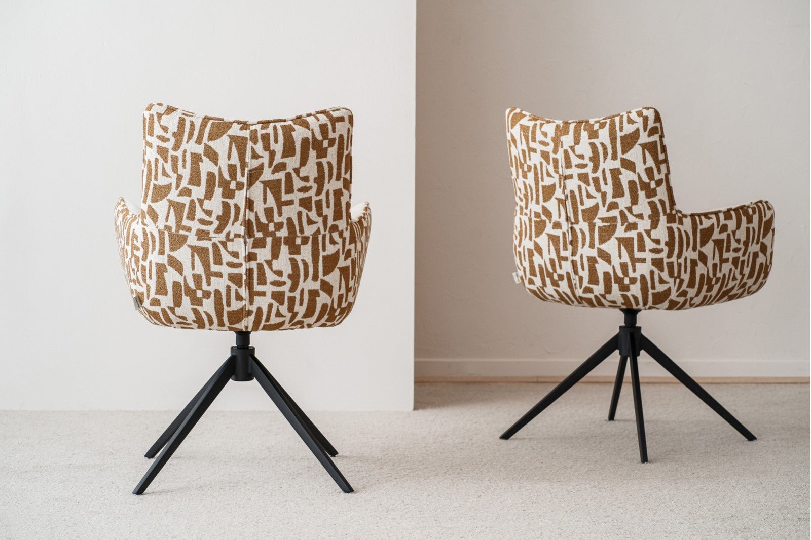 Este elegante set de dos sillas Alse de comedor combina confort y estilo contemporáneo. Su interior está tapizado con un tejido aterciopelado en tono marfil claro, que aporta suavidad y calidez al contacto. El exterior, en contraste, presenta una tela de textura más gruesa con un delicado estampado geométrico en tonos claros y ocres, ofreciendo un diseño sofisticado y moderno.