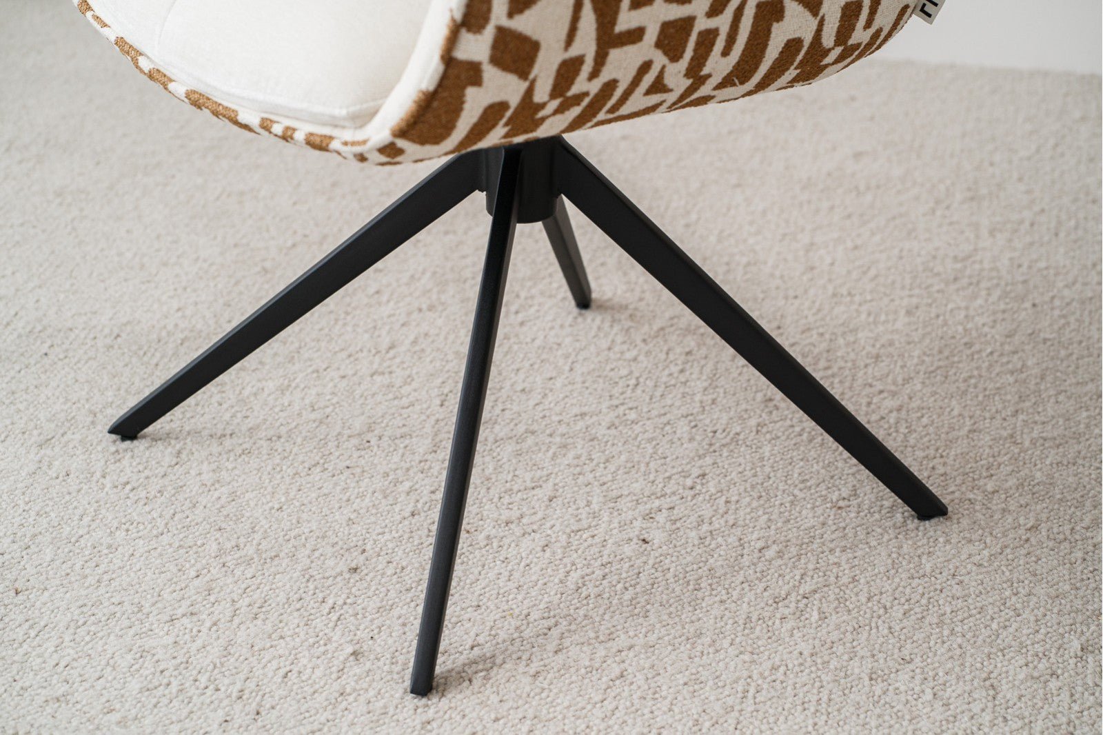 La base giratoria metálica en acabado negro mate refuerza su carácter contemporáneo, aportando estabilidad y funcionalidad, ideal tanto para comedores como para acogedores espacios de trabajo.
