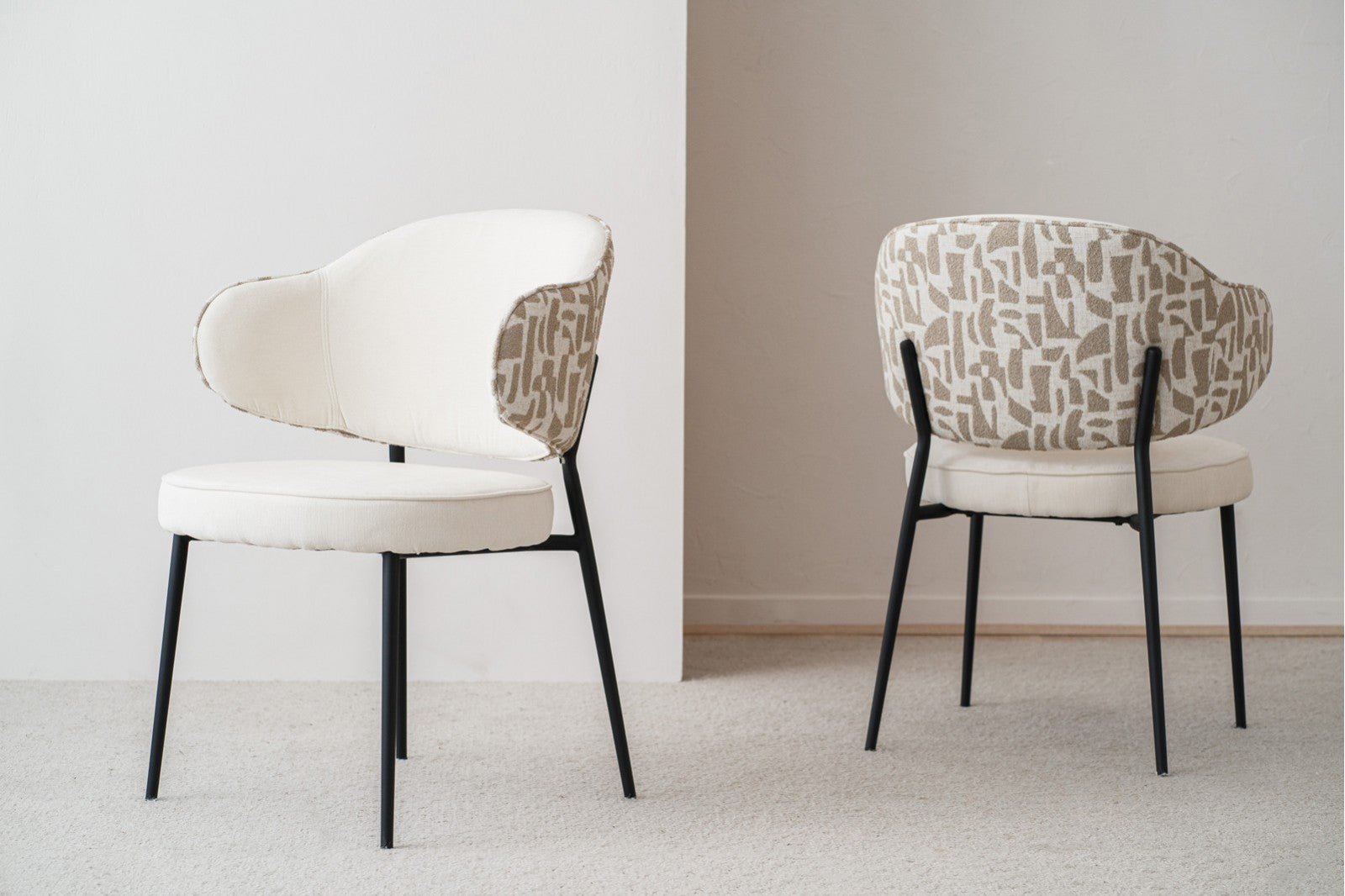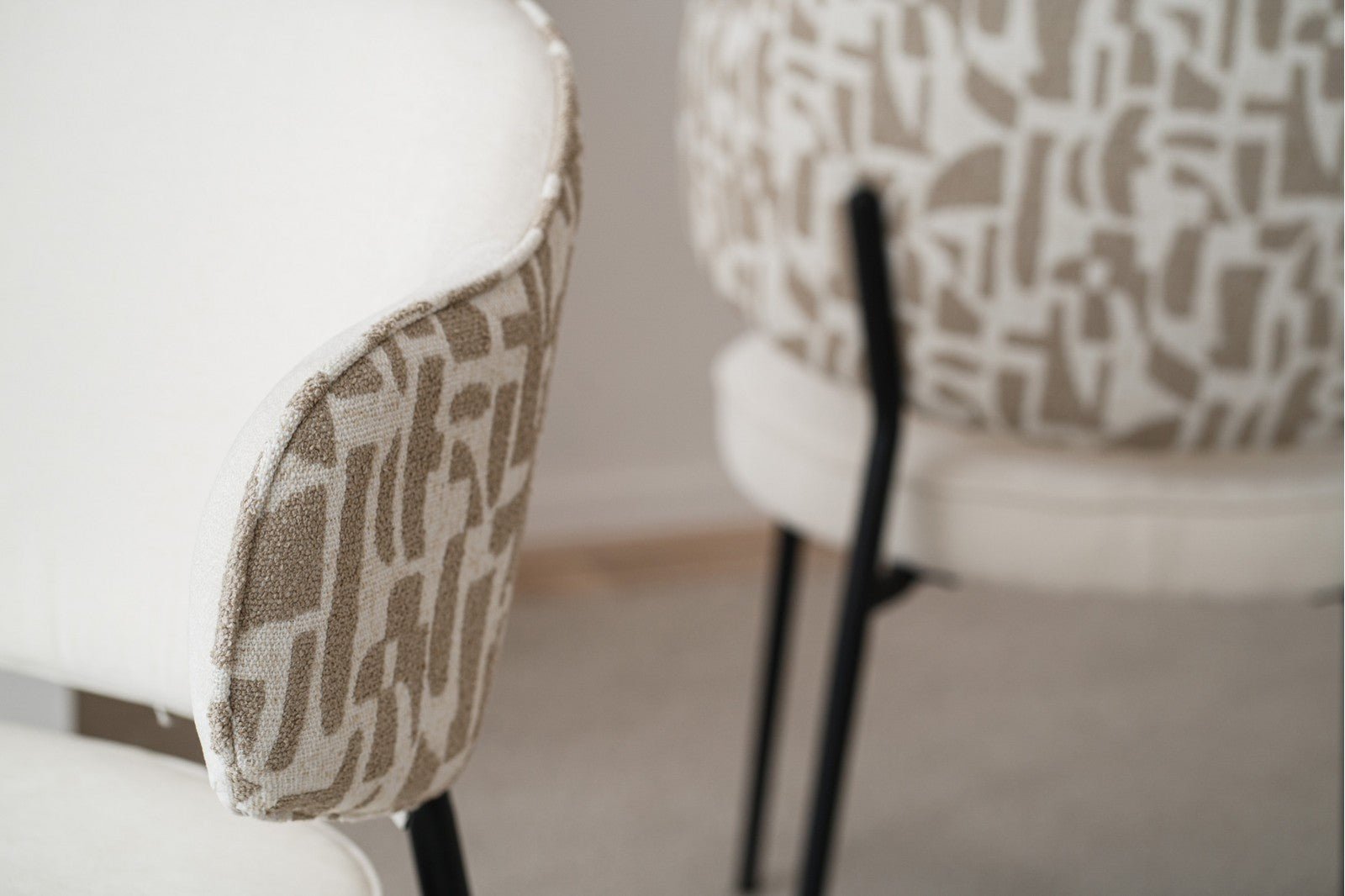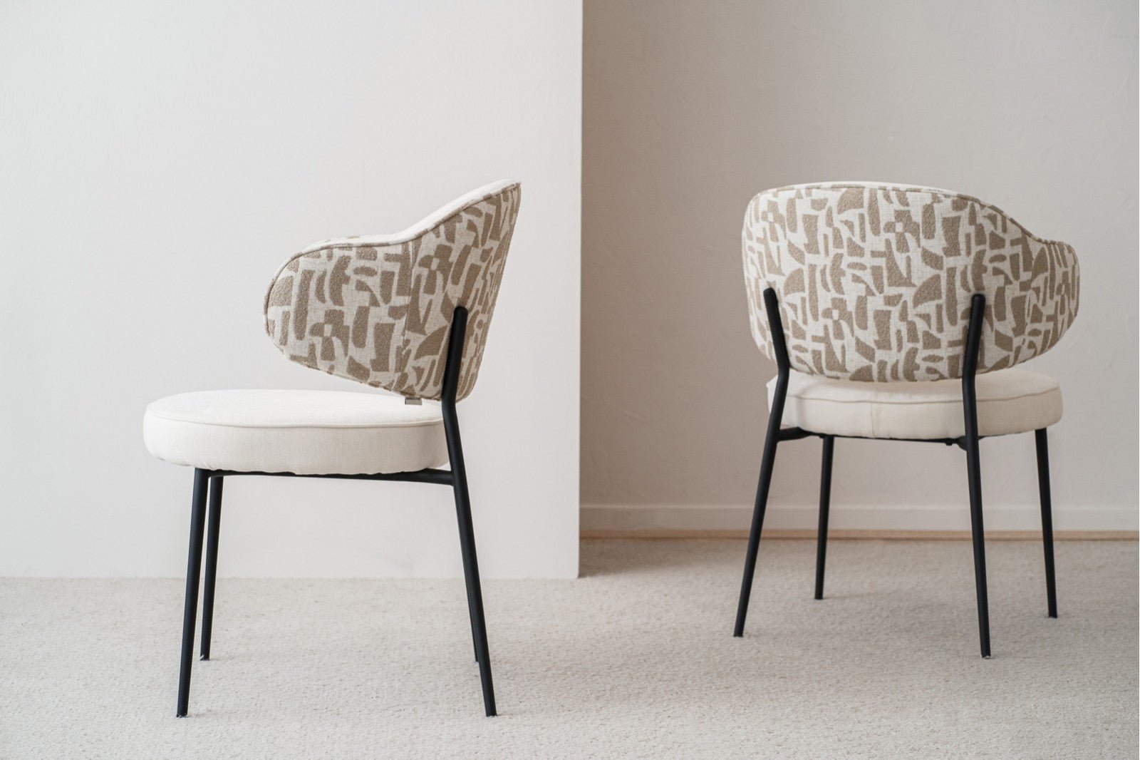 Este set de dos sillas Eclo combina diseño contemporáneo y confort excepcional. El interior está tapizado con un tejido aterciopelado en tono beige suave, mientras que la parte trasera presenta un tejido más grueso con un elegante estampado geométrico en tonos beige y piedra, creando un contraste sutil y sofisticado.