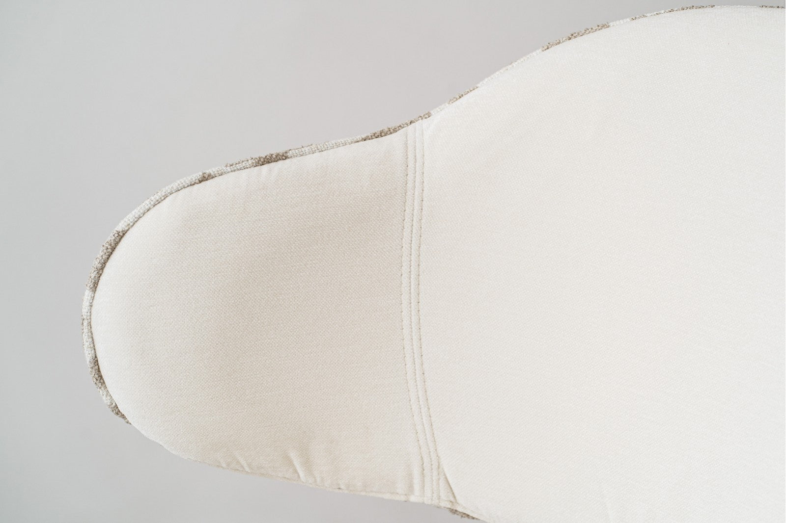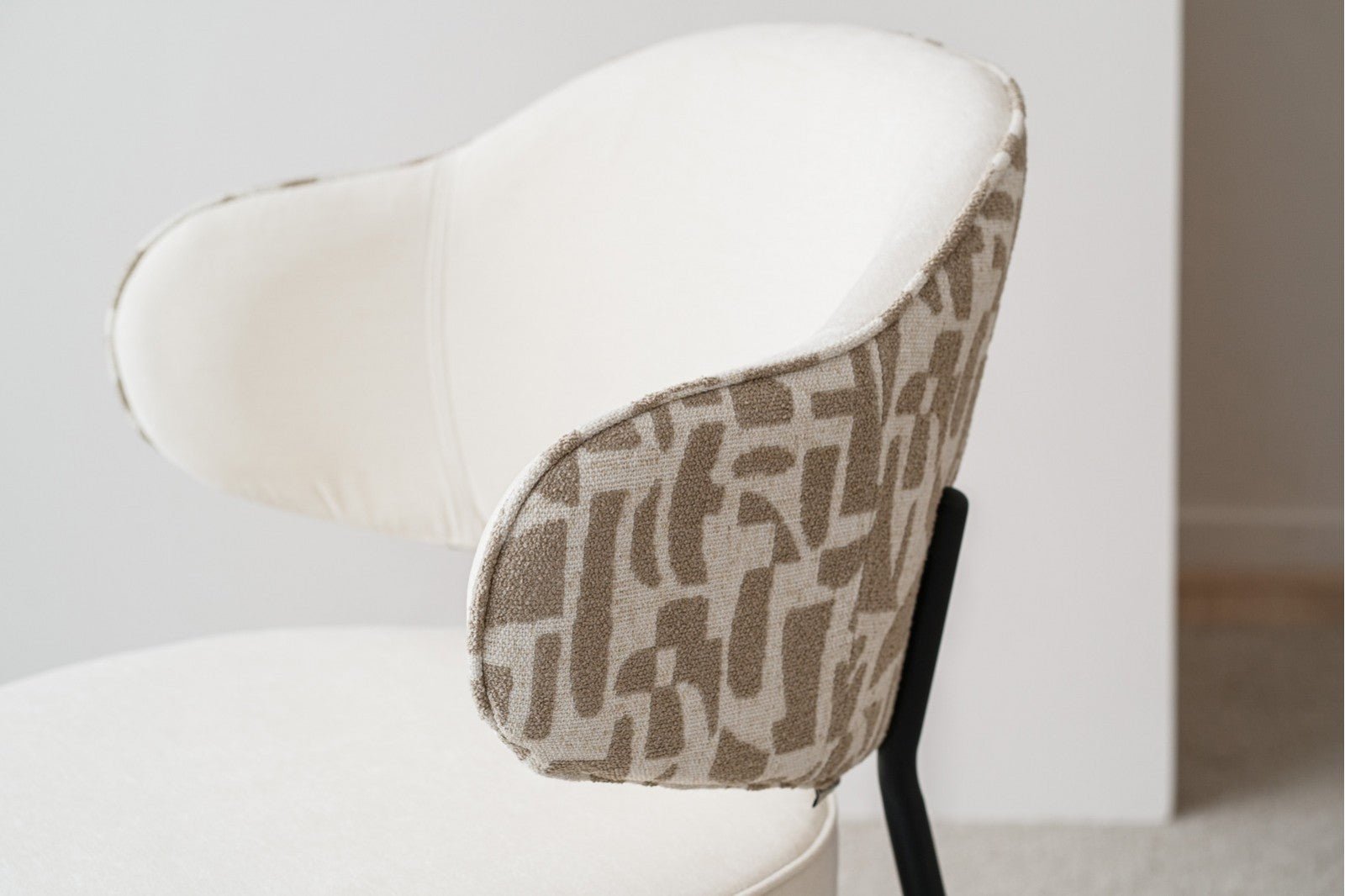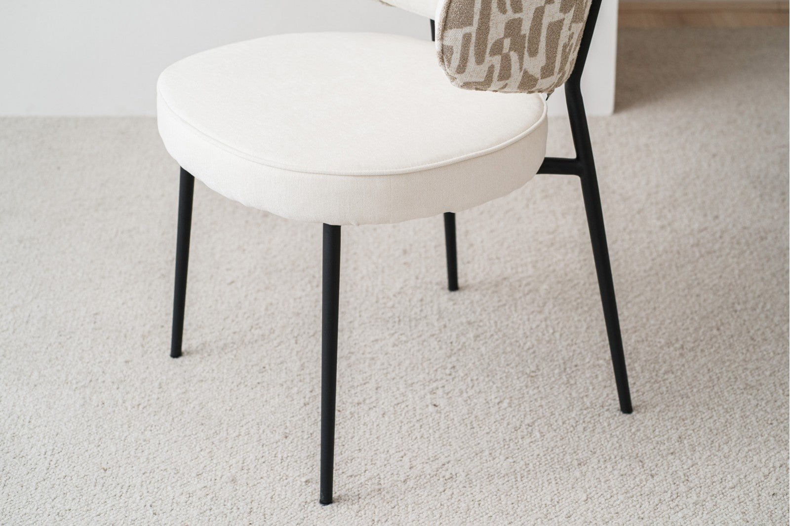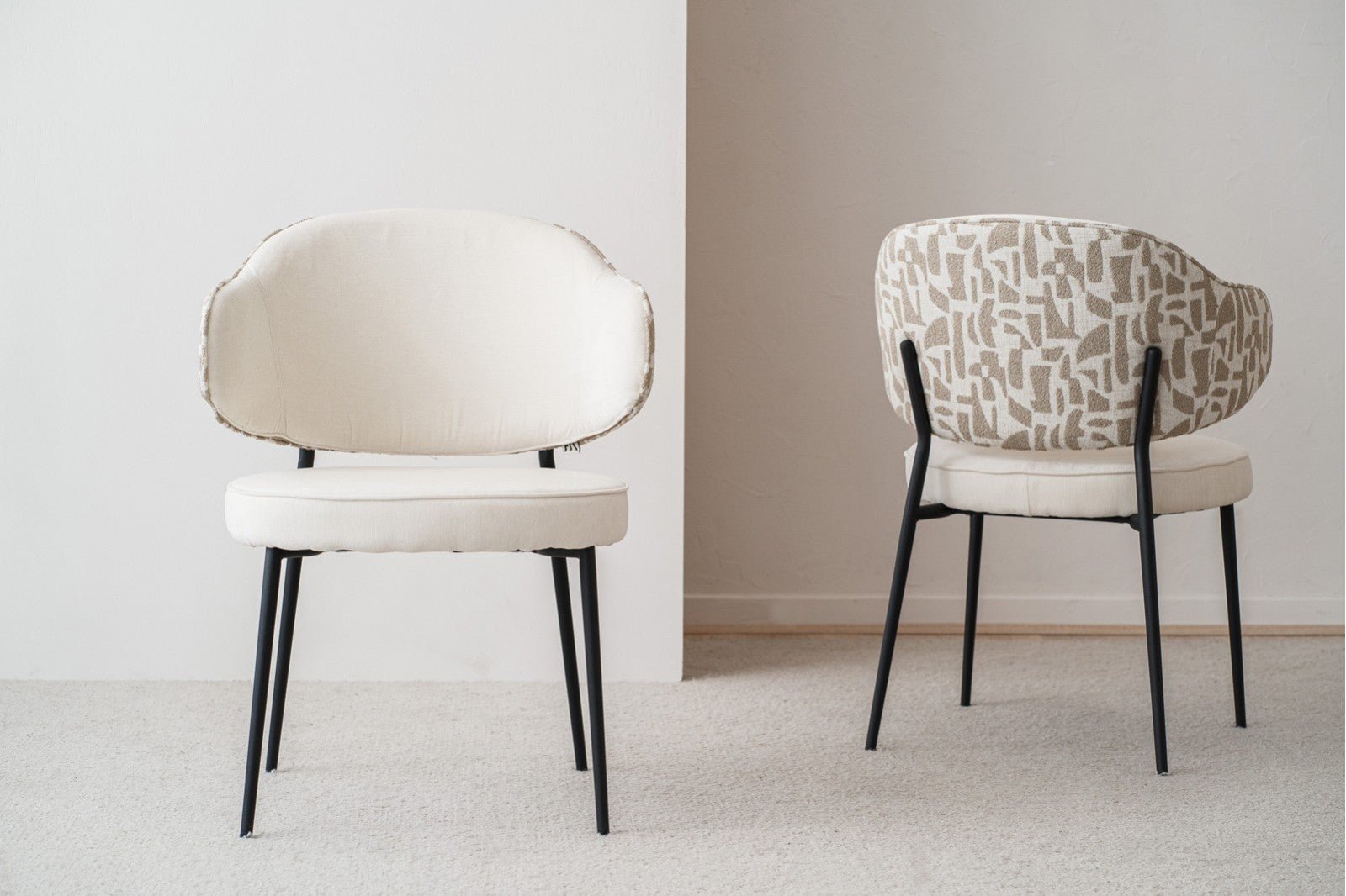 Este set de dos sillas Eclo combina diseño contemporáneo y confort excepcional. El interior está tapizado con un tejido aterciopelado en tono beige suave, mientras que la parte trasera presenta un tejido más grueso con un elegante estampado geométrico en tonos beige y piedra, creando un contraste sutil y sofisticado.