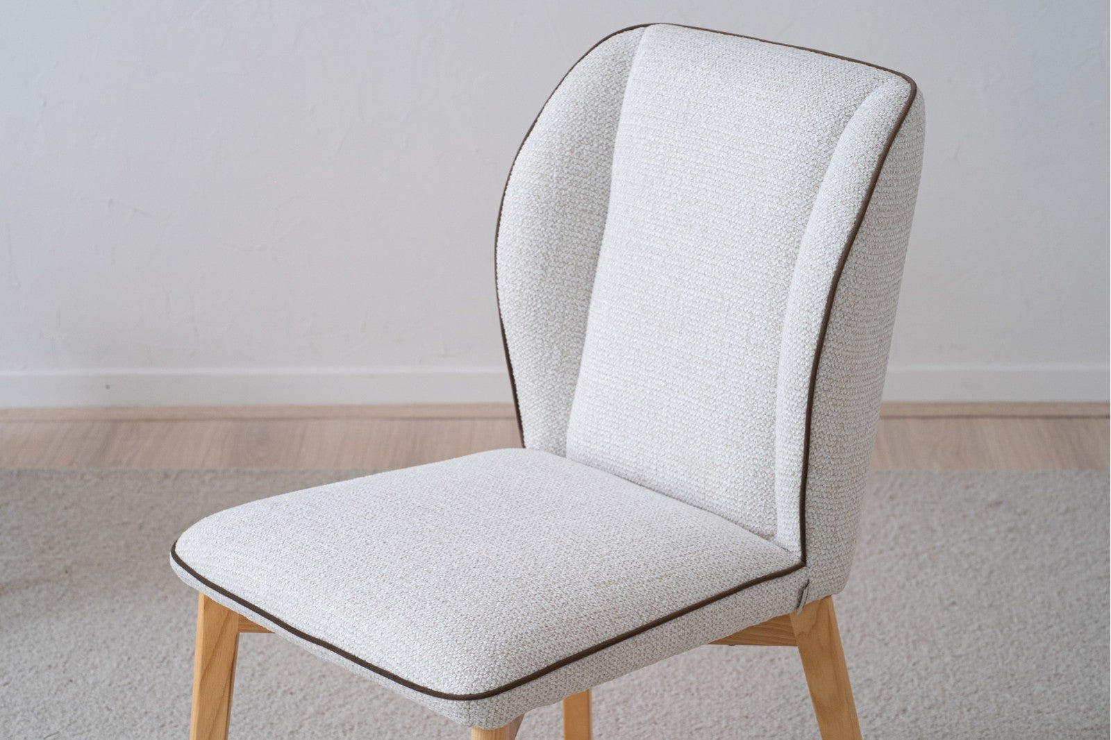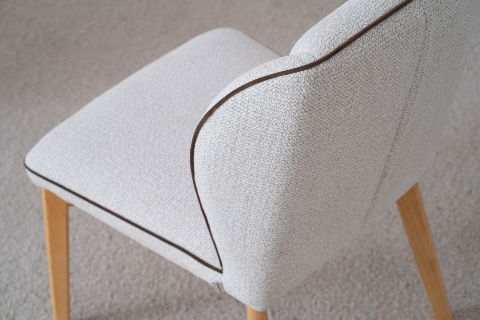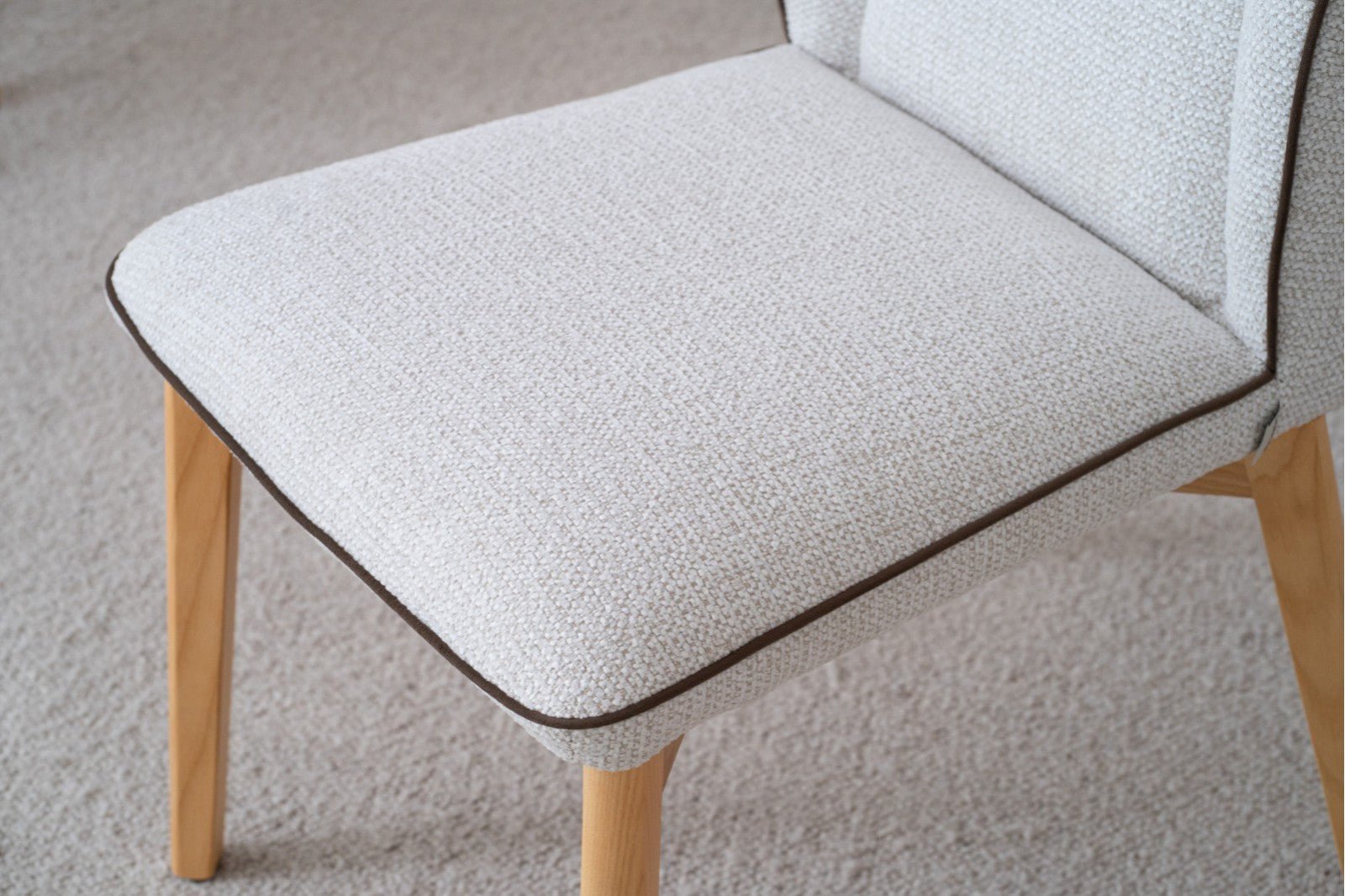 Set de 2 sillas de comedor tapizadas en 100% poliéster water proof color marfil con textura y con un ribete color marrón y las patas en madera maciza de roble en color natural. Las patas requieren montaje.