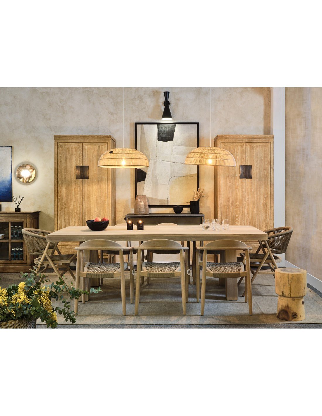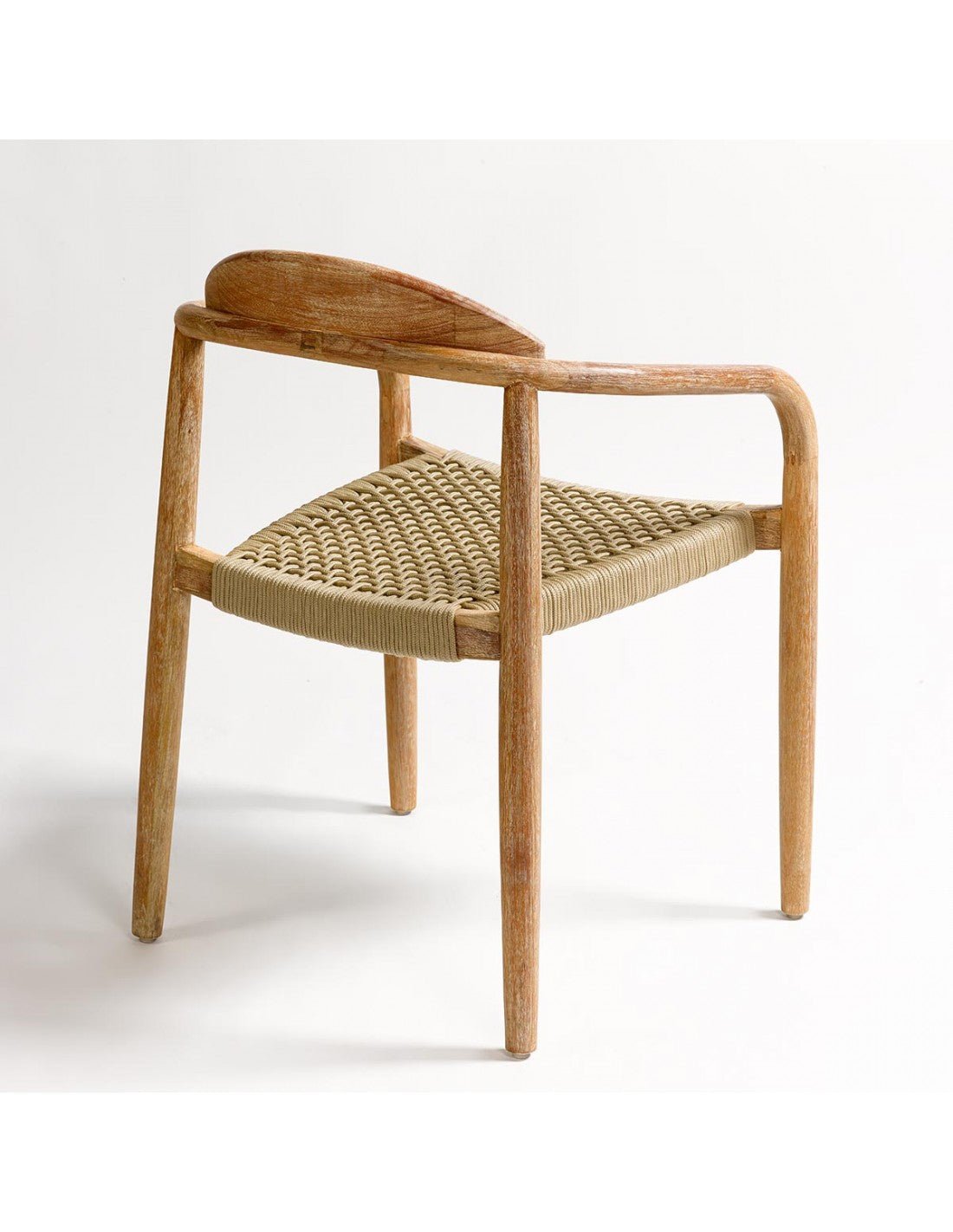 Silla con brazos de madera de eucalipto en color natural. Asiento de cuerda en color arena.