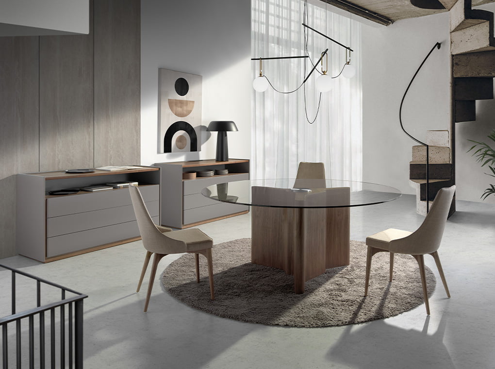 Silla comedor tapizada en tela color beige con estructura de patas en madera de fresno color nogal que aportará un toque de elegancia y calidez a su hogar.