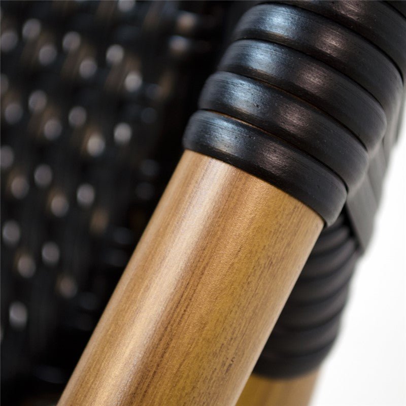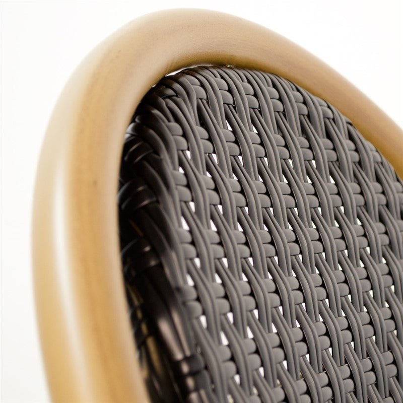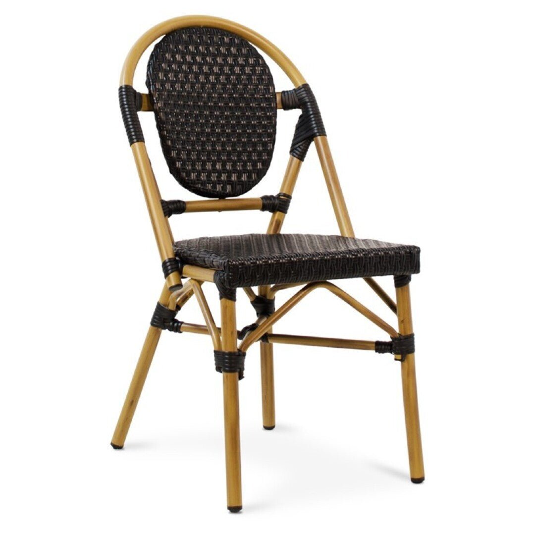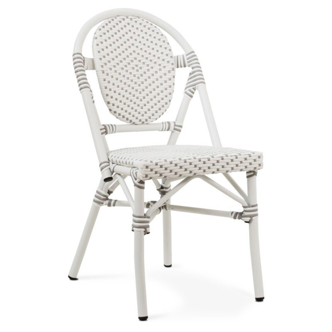 Silla fabricada en aluminio con acabado en ratán con tejido sintético, es apta para uso exterior, es apilable y no requiere montaje, disponible en diferentes colores blanco/gris, negro y rojo/crema.