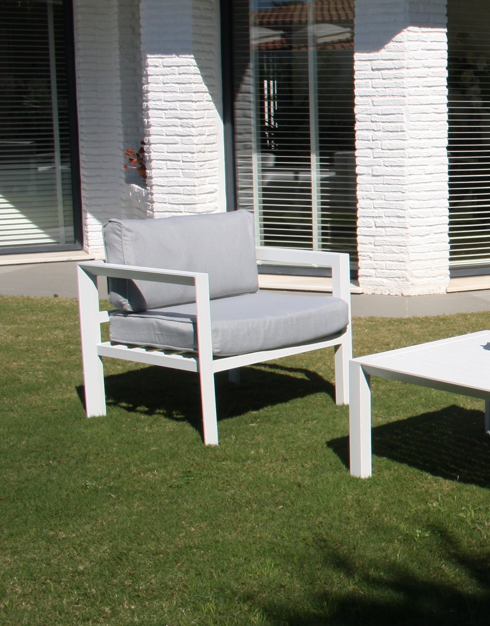 Sillón de exterior fabricado en aluminio color blanco con cojines de color gris.