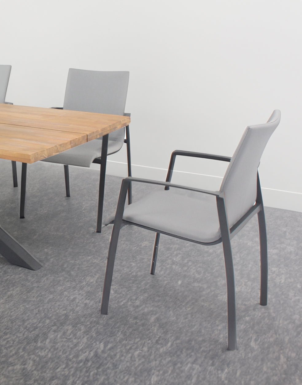 Sillón de exterior fabricado en aluminio color antracita acolchado en textilene color gris.