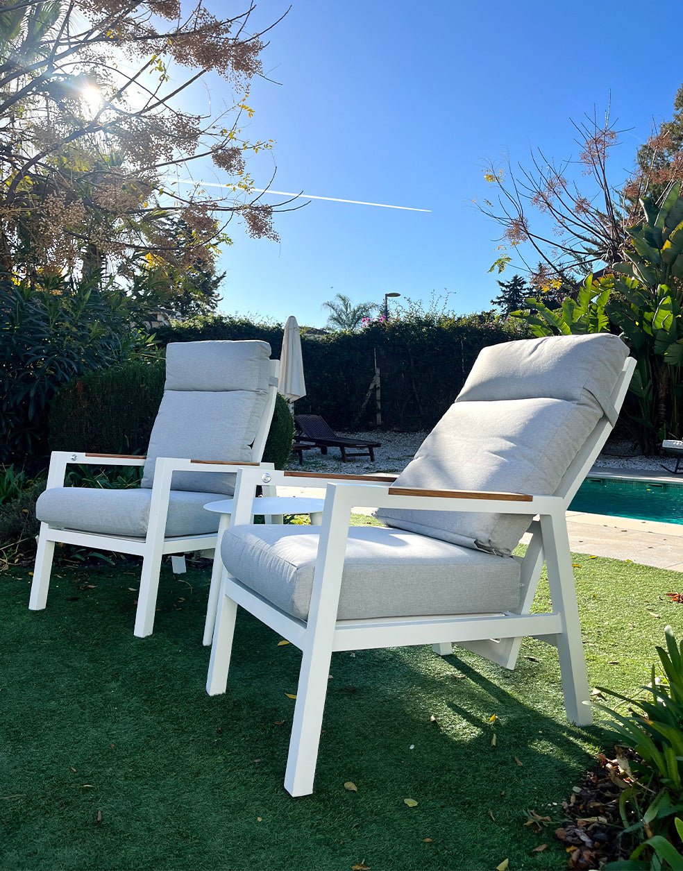 Sillón reclinable de aluminio blanco con detalle en reposabrazos en madera de teca y cojines en poliéster de color gris.