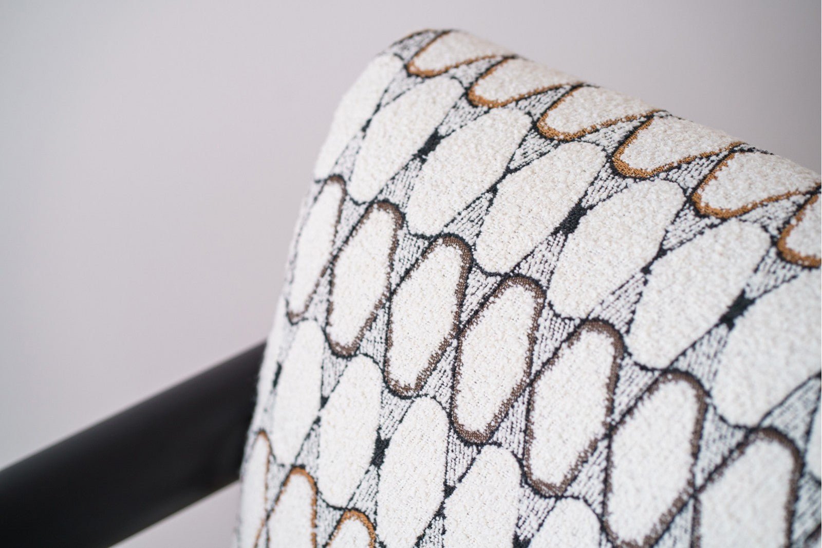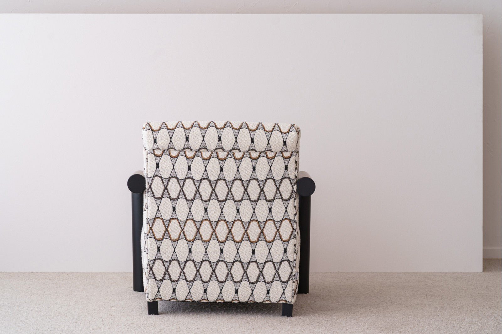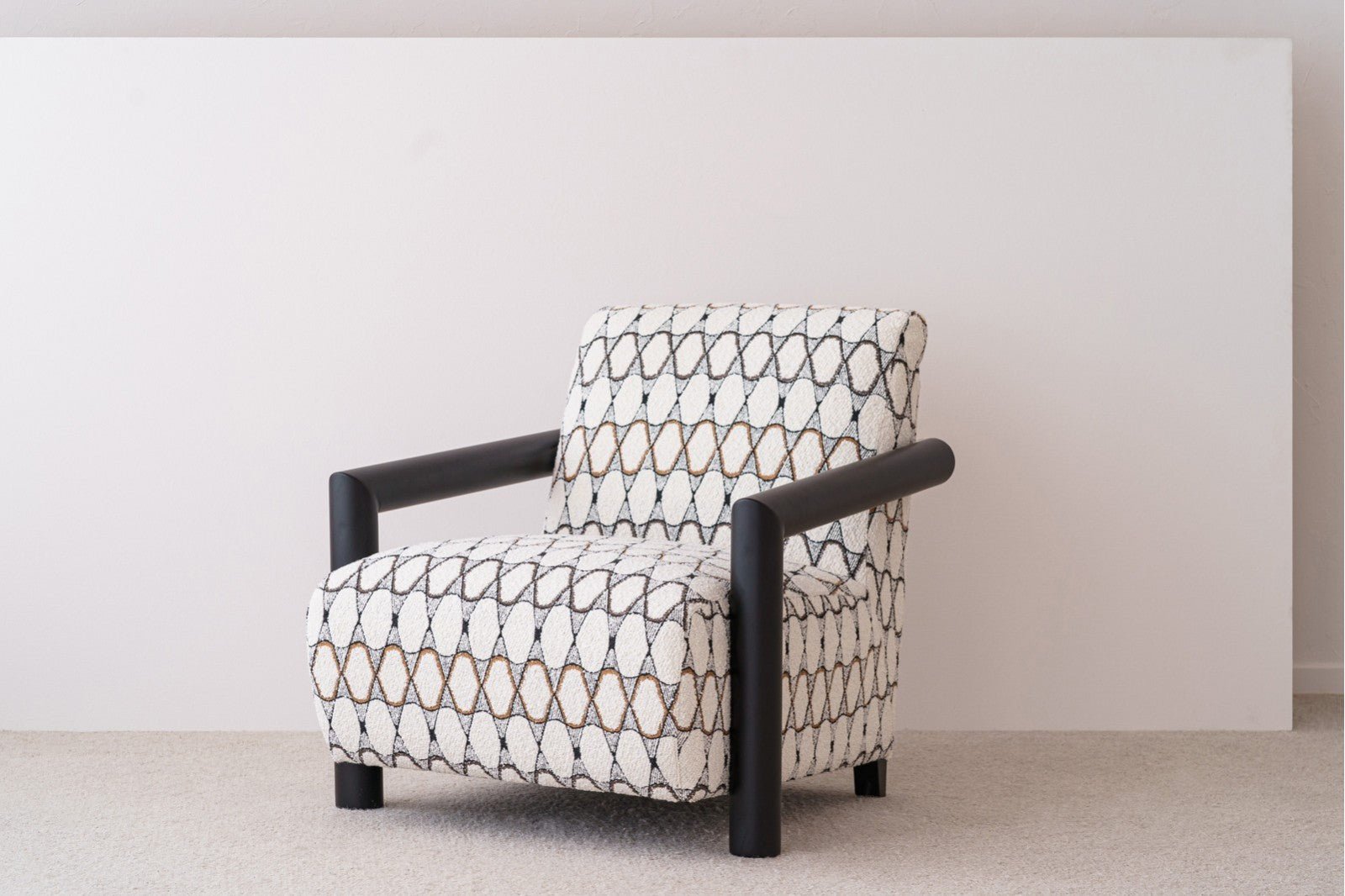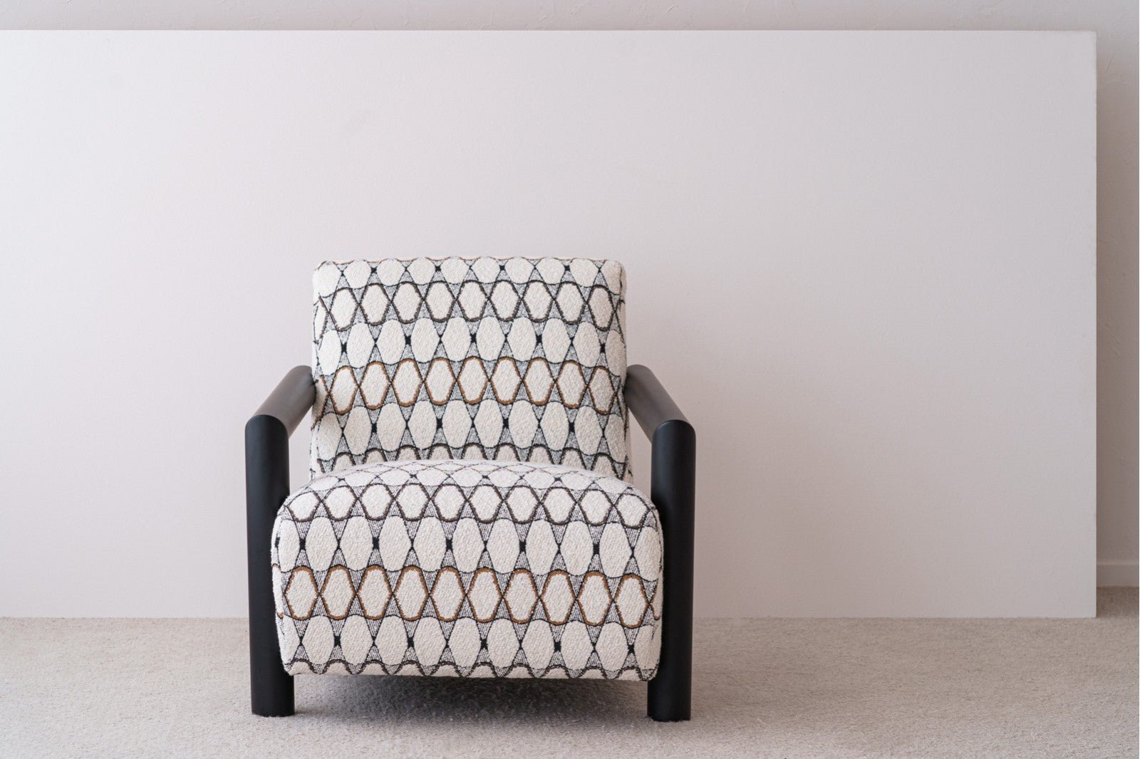 Butaca de formato cuadrado tapizada en 100% poliéster en tela suave bouclé con un patrón geométrico en líneas negras con toque ocres, los brazos son de forma circular realizados en madera maciza de roble en color negro mate.