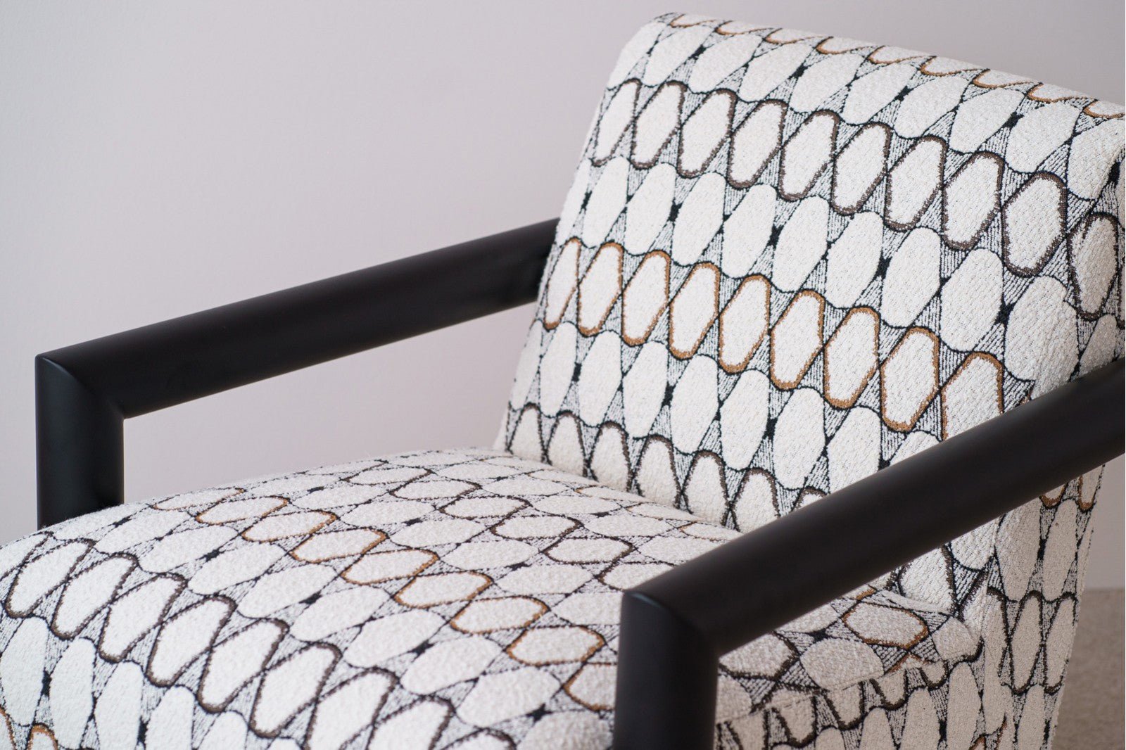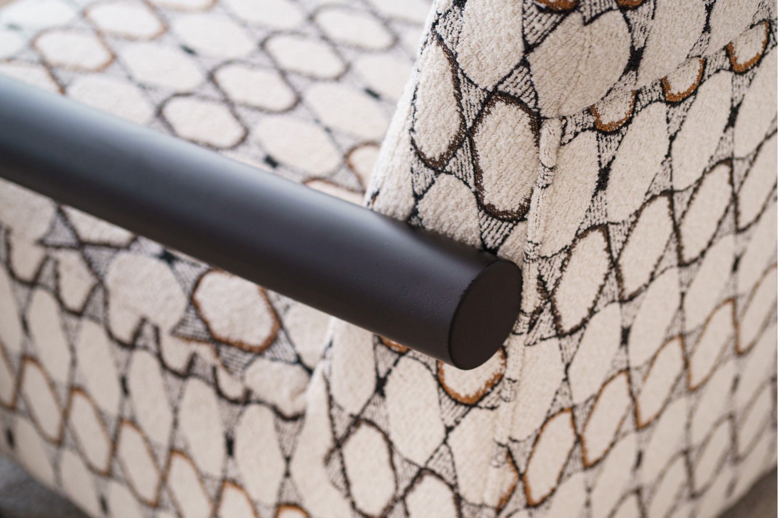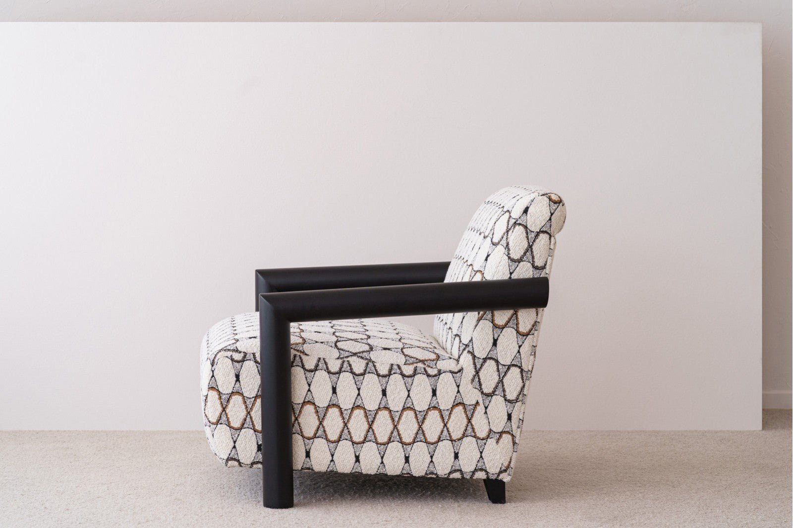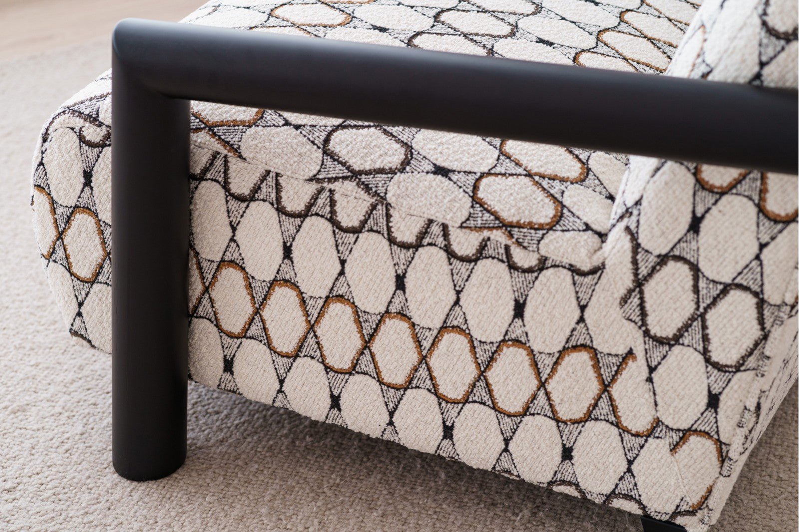 Butaca de formato cuadrado tapizada en 100% poliéster en tela suave bouclé con un patrón geométrico en líneas negras con toque ocres, los brazos son de forma circular realizados en madera maciza de roble en color negro mate.