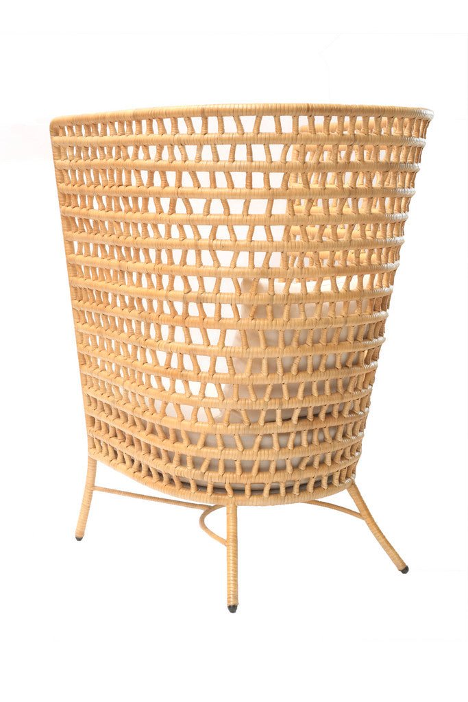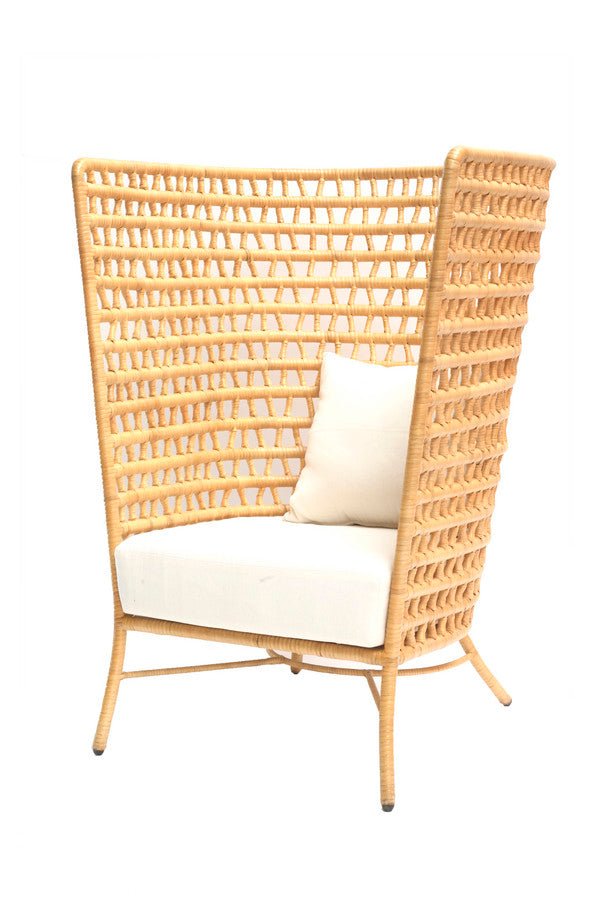 Elegante butaca alta elaborada en ratán natural, combinada con un tejido cuidadosamente trabajado que aporta textura y calidez. Sus cojines en tono beige ofrecen confort y armonizan con cualquier estilo de decoración, convirtiéndola en la opción perfecta para espacios interiores o terrazas con un toque natural y acogedor.