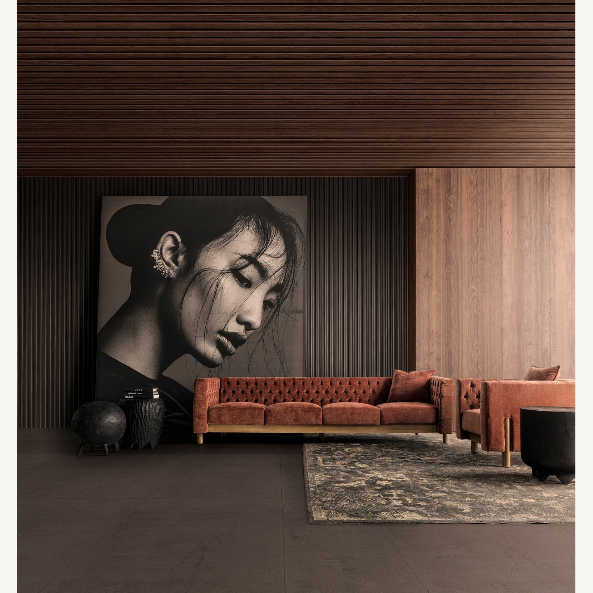 Sillón Carlos tapizado en poliéster color burdeos con estructura y patas en madera de pino color natural.