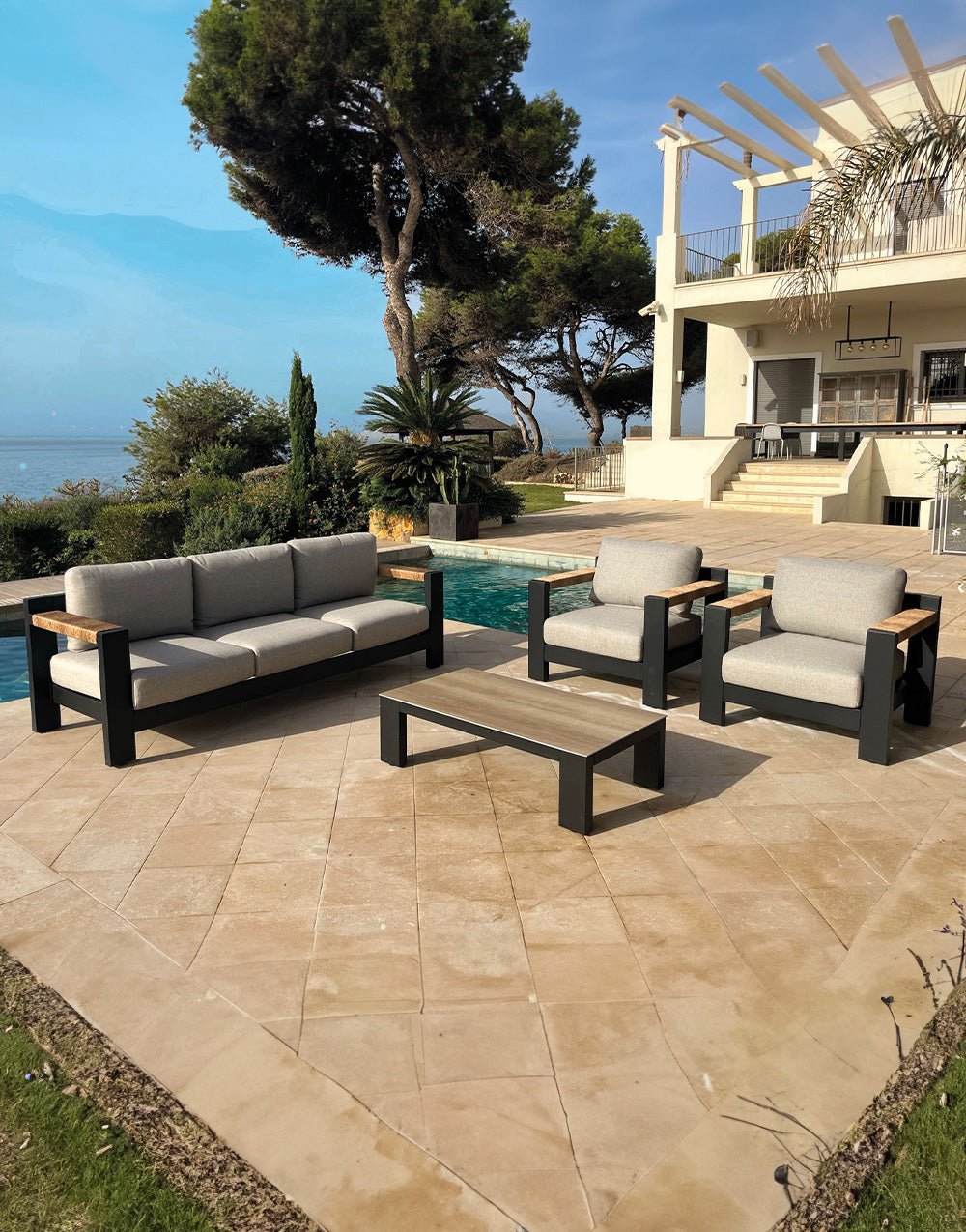 Set compuesto por sofá + 2 sillones + mesa fabricado en aluminio de color antracita. Reposabrazos recubiertos de fibra sintética. Mesa de centro baja de aluminio. Tablero compacto imitación madera. Cojinería en color beige.