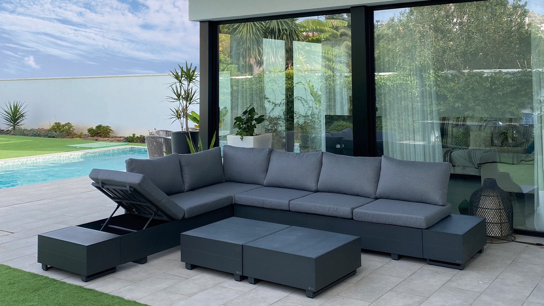 Conjunto de exterior fabricado en aluminio color antracita o blanco compuesto por 2 sofás de 3 plazas, 2 mesas laterales y 2 mesas de centro. Cojinería en color gris. Mesas de aluminio con cristal cerámico gris.Asiento exterior elevable con efecto tumbona.