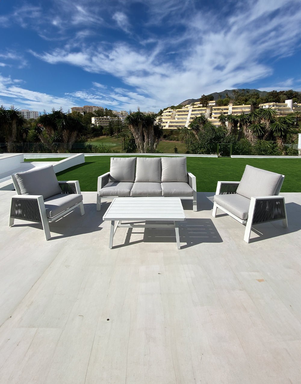 Conjunto de exterior compuesto por: 1 sofá 3 plazas, 2 sillones y mesa fabricado en aluminio color blanco y cuerda con cojines en color gris.