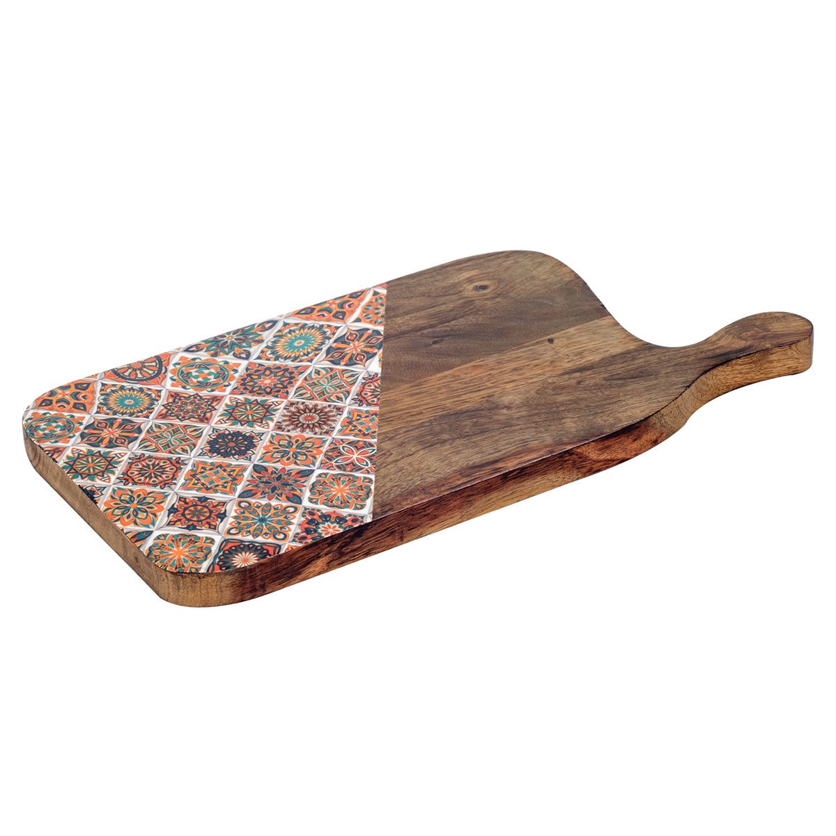 Tabla de cortar fabricada en madera natural y esmaltada parcialmente en multicolor.