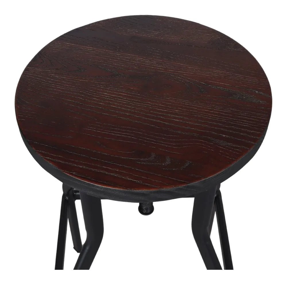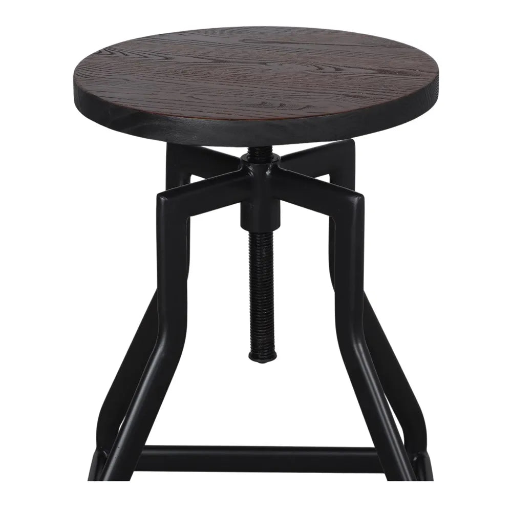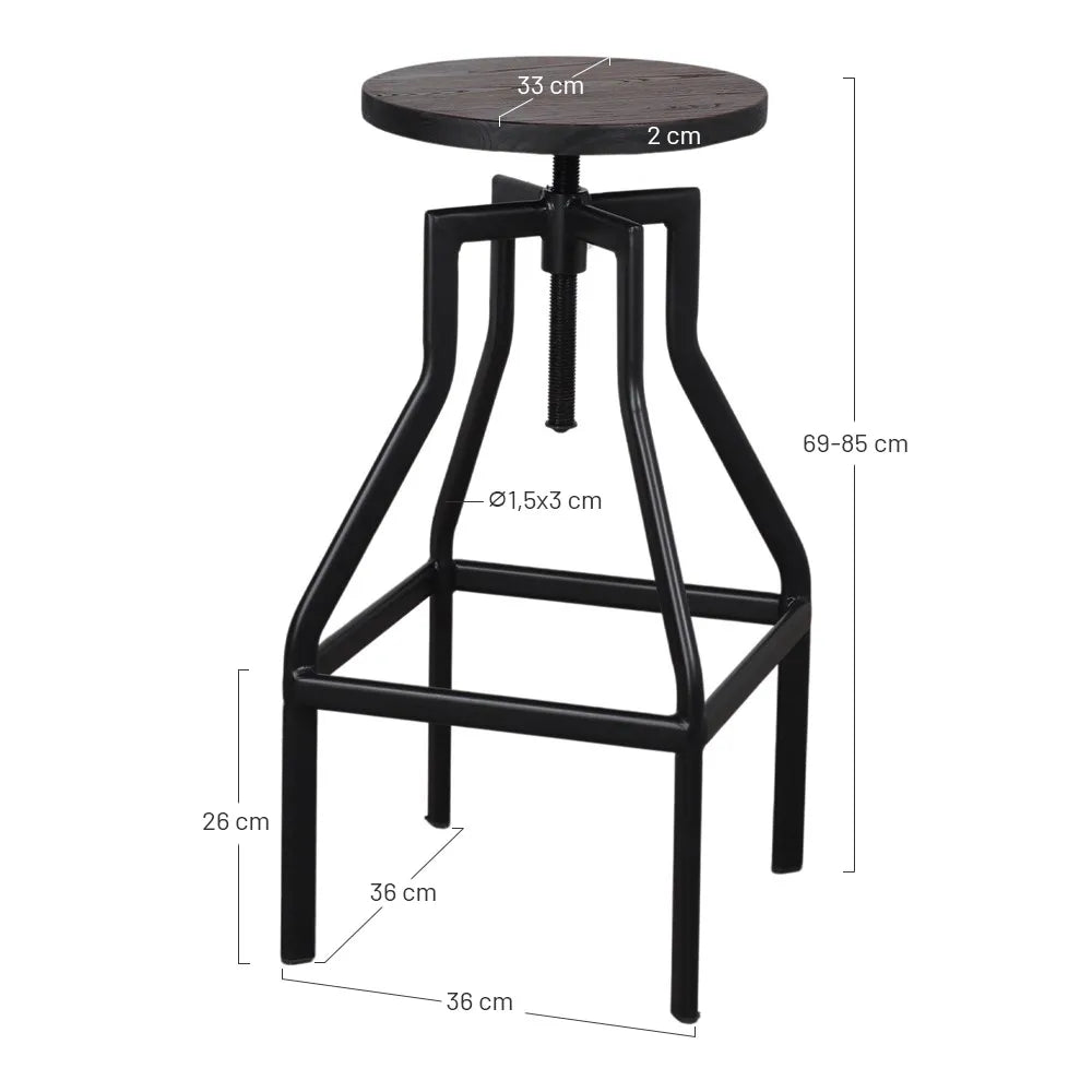 Taburete de estilo industrial con estructura de metal color negro y asiento de madera color natural. De altura regulable y acabado en pintura powder coated. Sí requiere montaje.