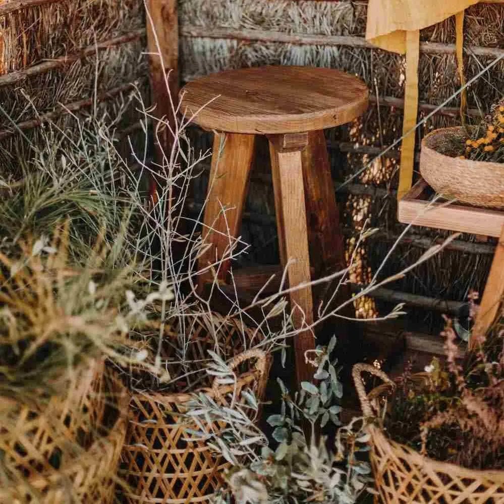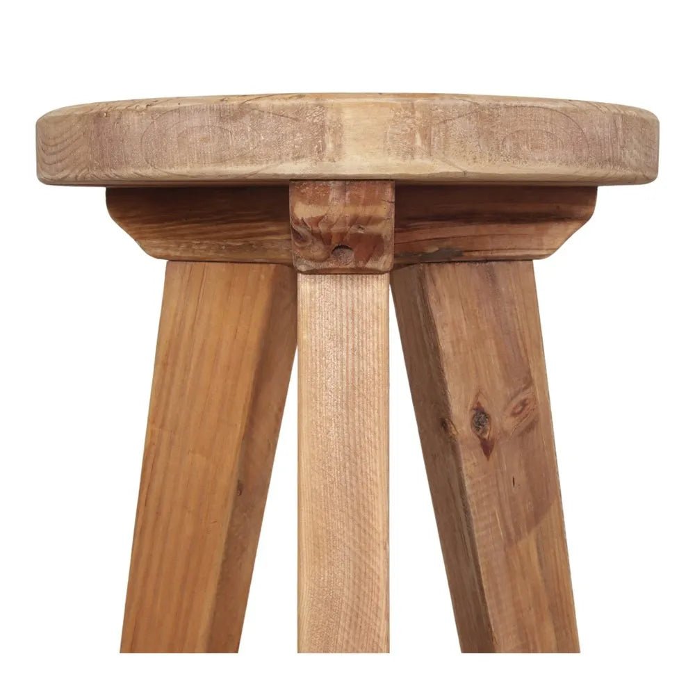 Taburete alto de estilo rústico-vintage fabricado en madera maciza de pino reciclado color natural.