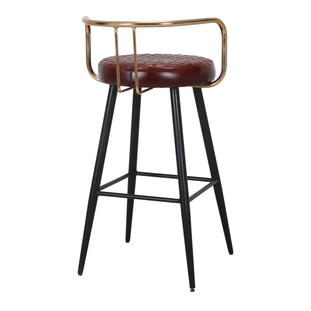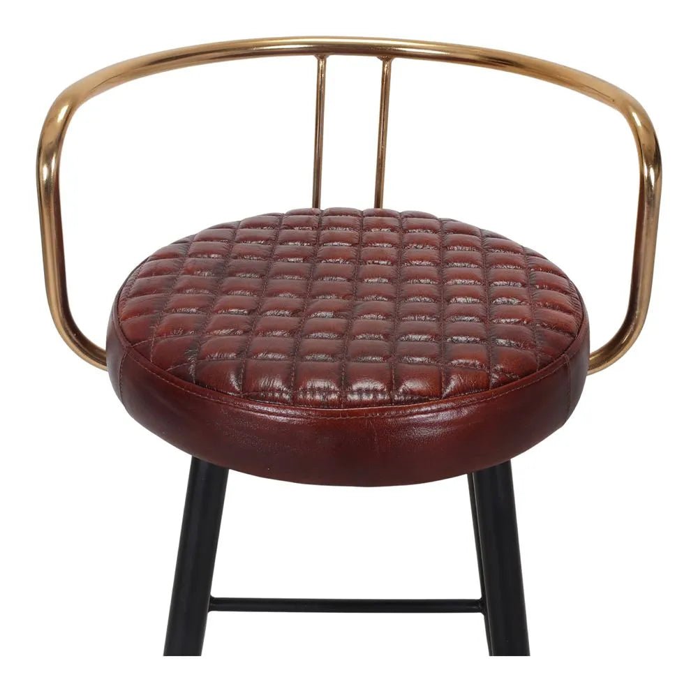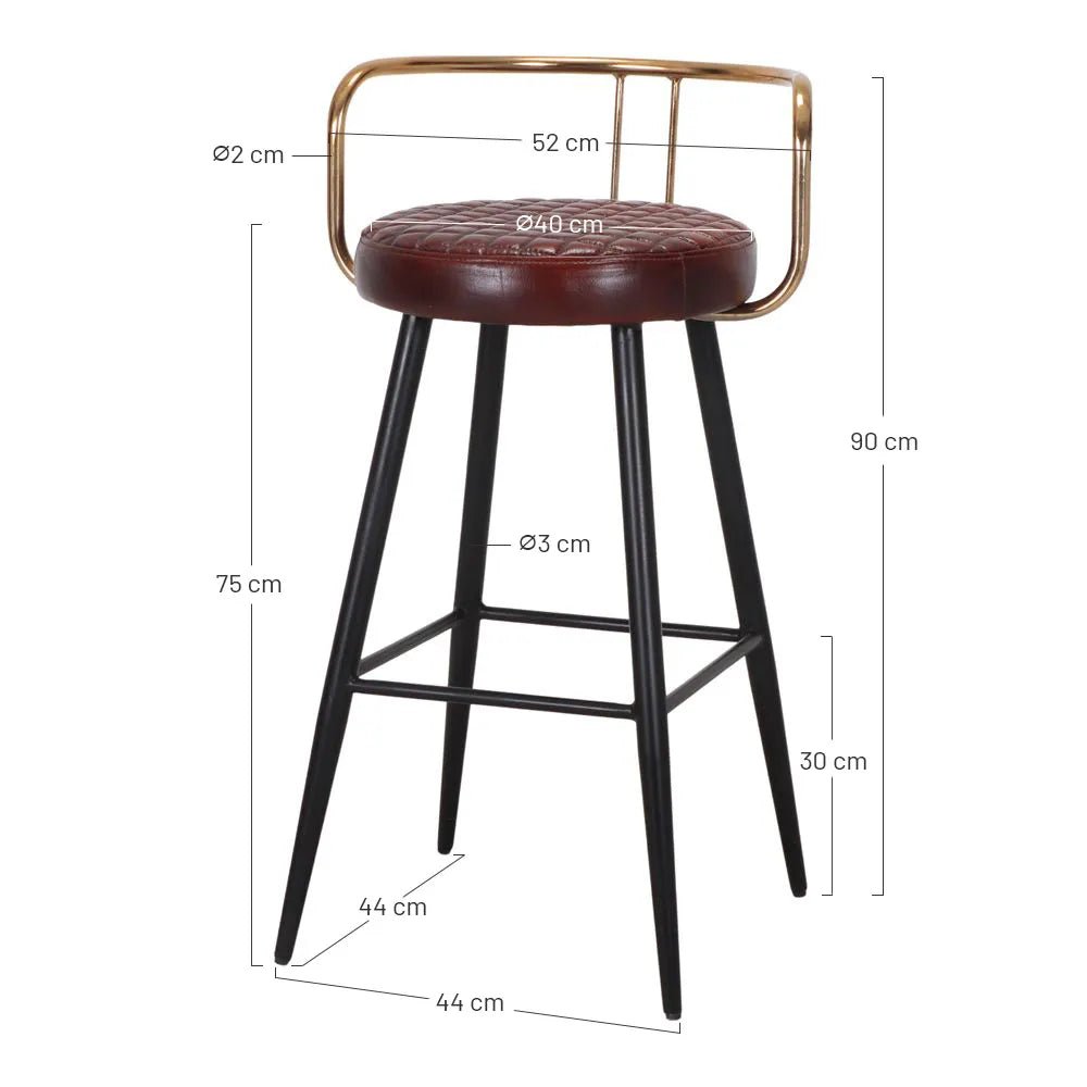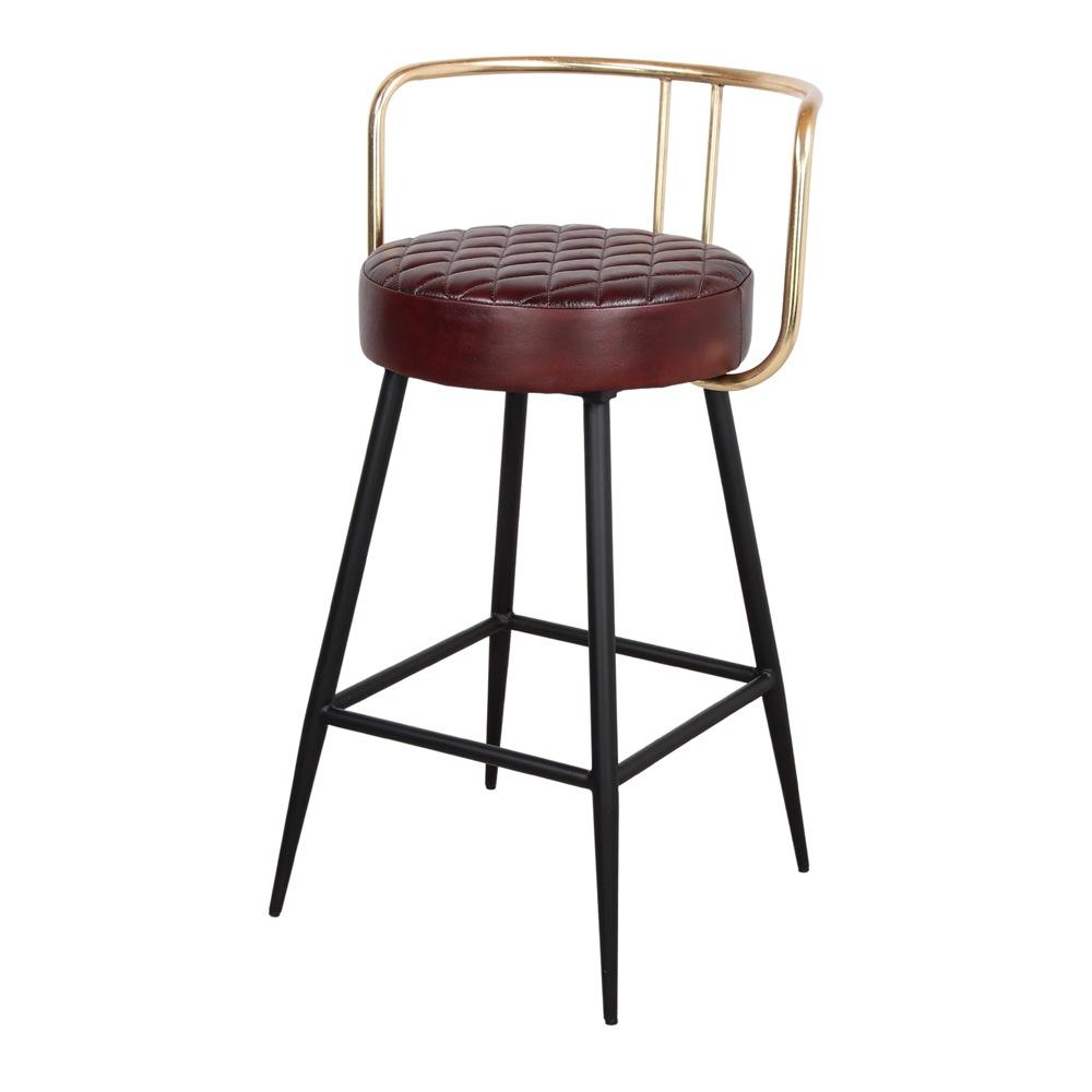 Taburete alto de estilo mid century con estructura tubular de acero acabada en pintura en polvo color negro y asiento de piel color marrón. Respaldo con acabado en baño latón color dorado.