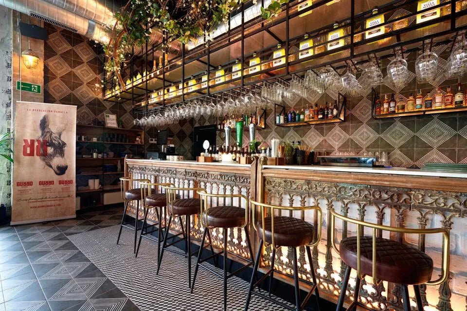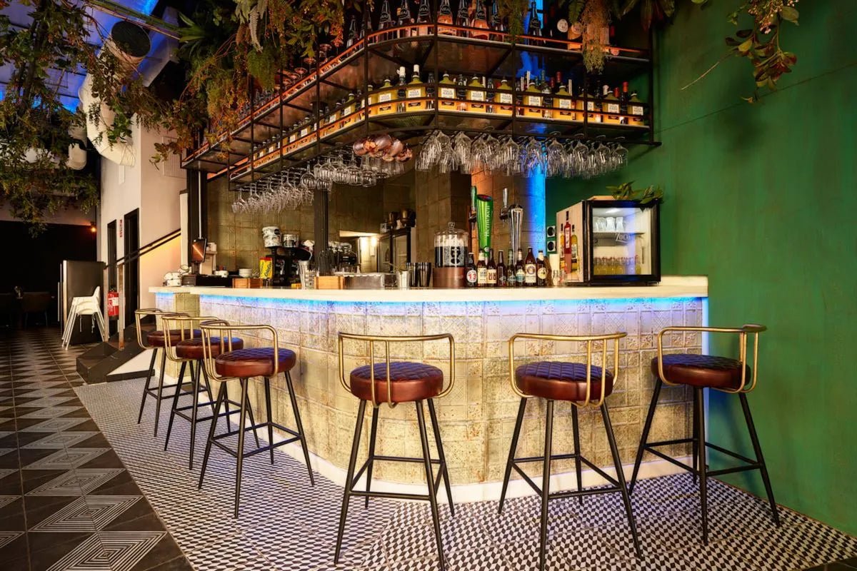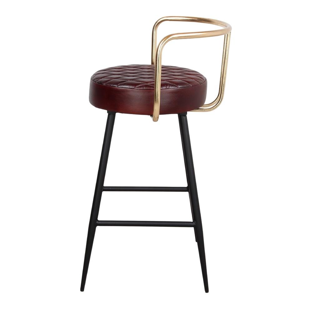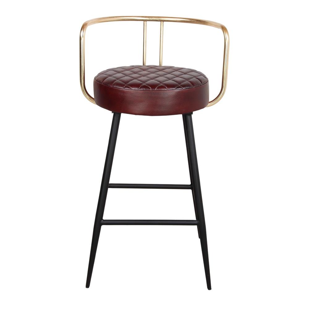 Taburete alto de estilo mid century con estructura tubular de acero acabada en pintura en polvo color negro y asiento de piel color marrón. Respaldo con acabado en baño latón color dorado.