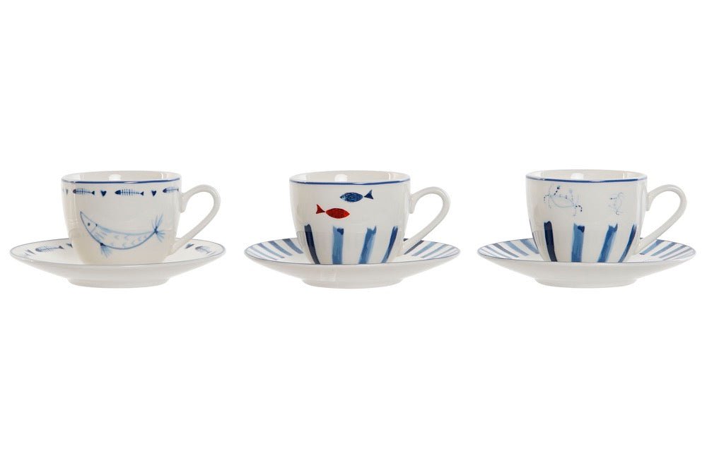 Precioso set de tazas con platillo que combina la calidez del desayuno con la frescura del mar, decorado con delicados peces pintados a mano en tonos azules vibrantes que evocan serenidad y elegancia costera.
