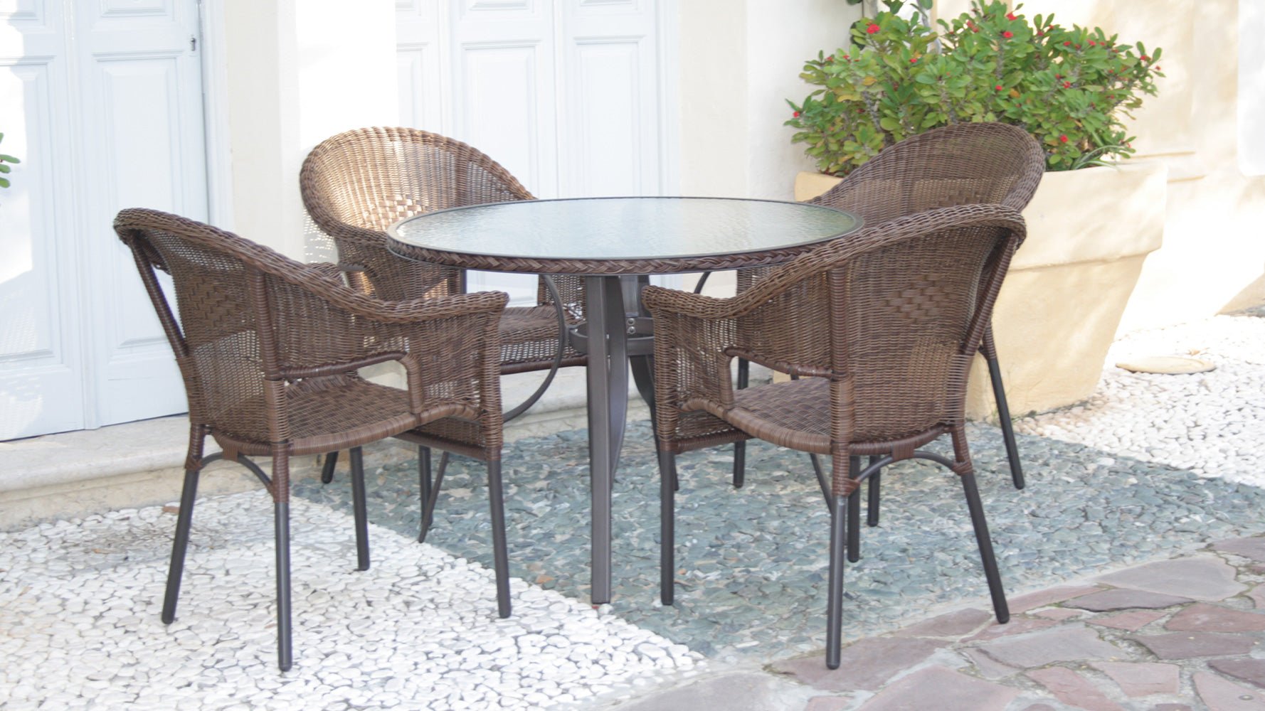 Mesa redonda de aluminio marrón con detalle en fibra del mismo color con cristal templado.