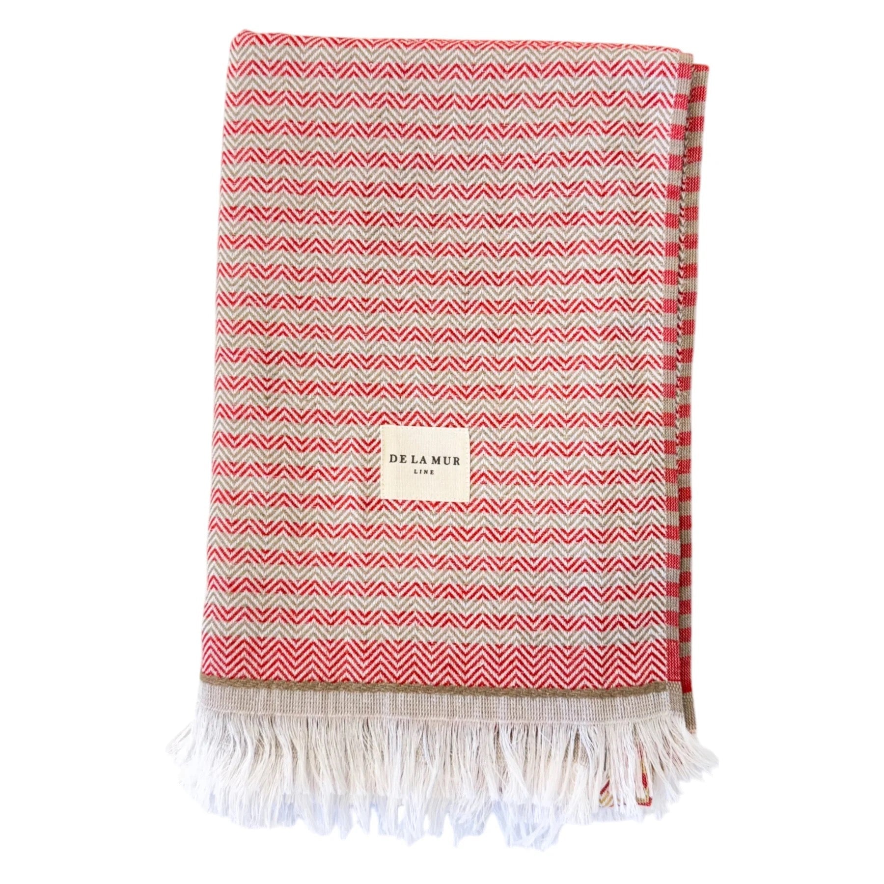 Toalla multiusos de tejido ligero con flecos en los laterales. Con estampado a rayas y zigzag en tonos rojo, beige y amarillo. Medida única. Para su correcto mantenimiento se aconseja lavarlo en frío y no utilizar secadora.