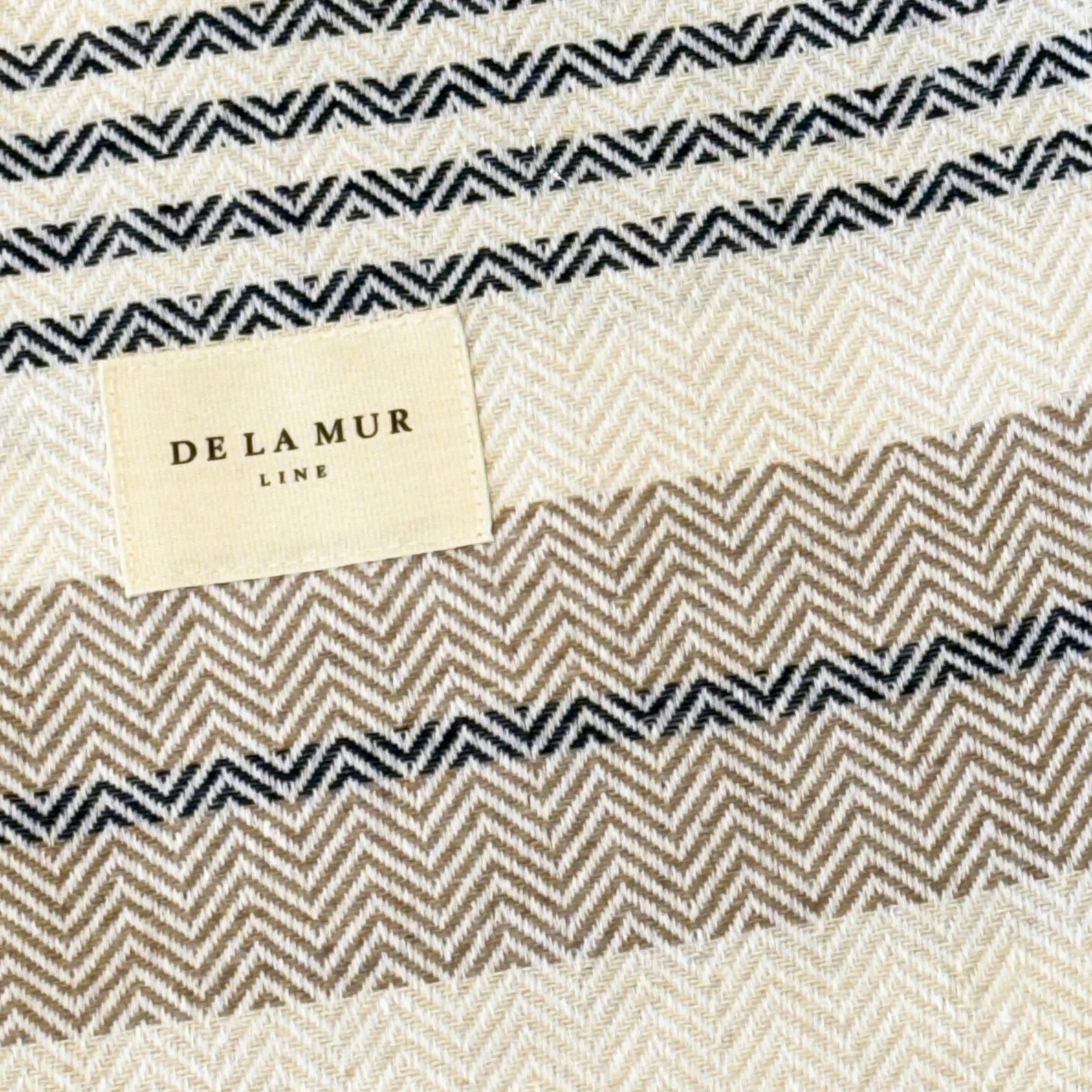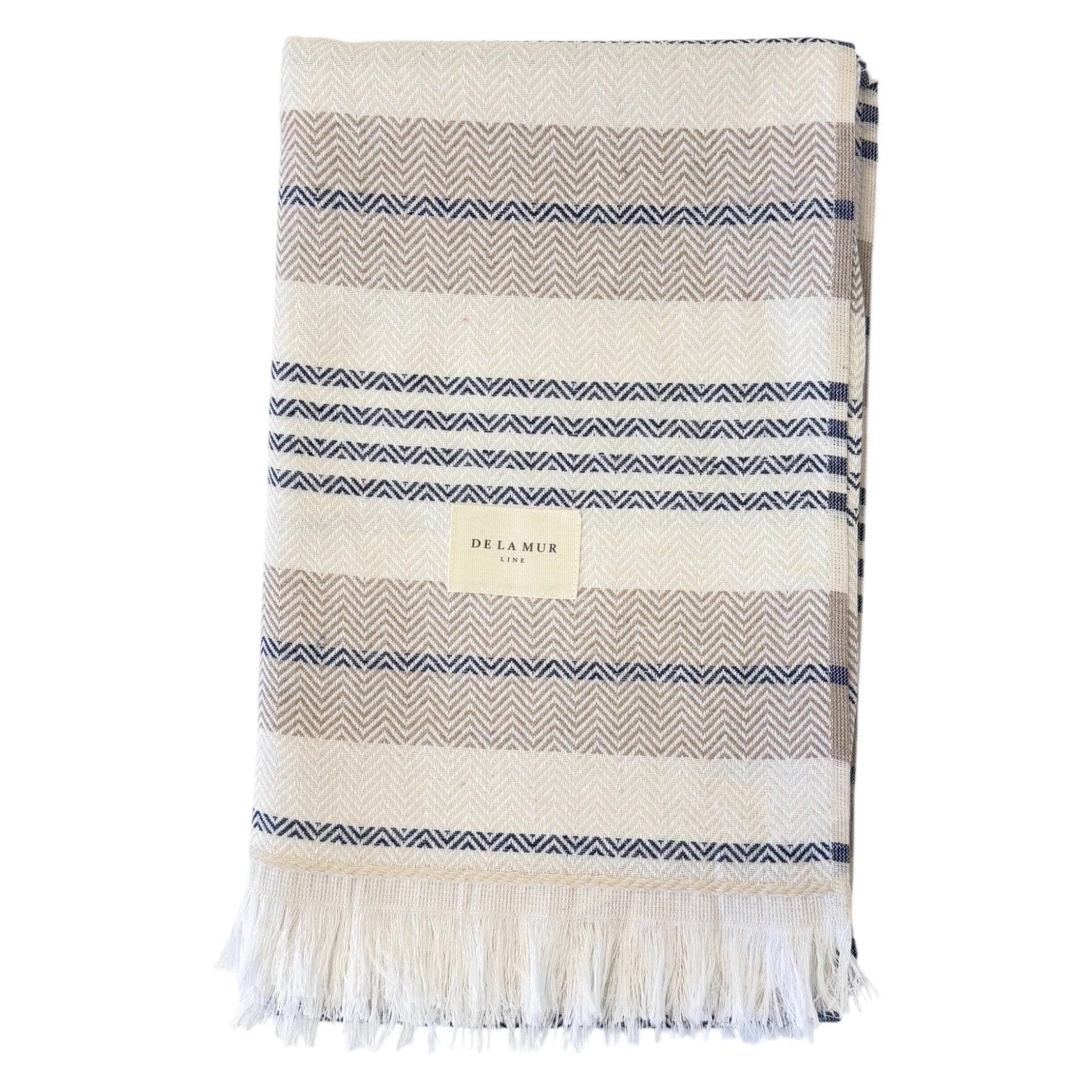 Toalla multiusos de tejido ligero con flecos en los laterales. Con estampado a rayas y zigzag en tonos azules, beige y crudo. Medida única. Para su correcto mantenimiento se aconseja lavarlo en frío y no utilizar secadora.
