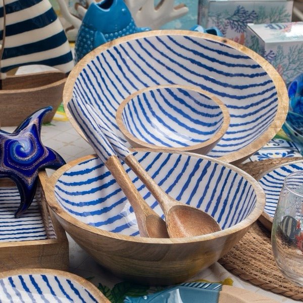 Bonito set de cuchara y tenedor para usar con ensaladeras de madera colores azul y blanco.