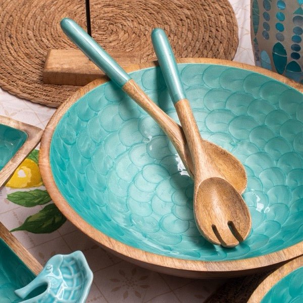 Bonito set de cuchara y tenedor para usar con ensaladeras de madera y nácar.