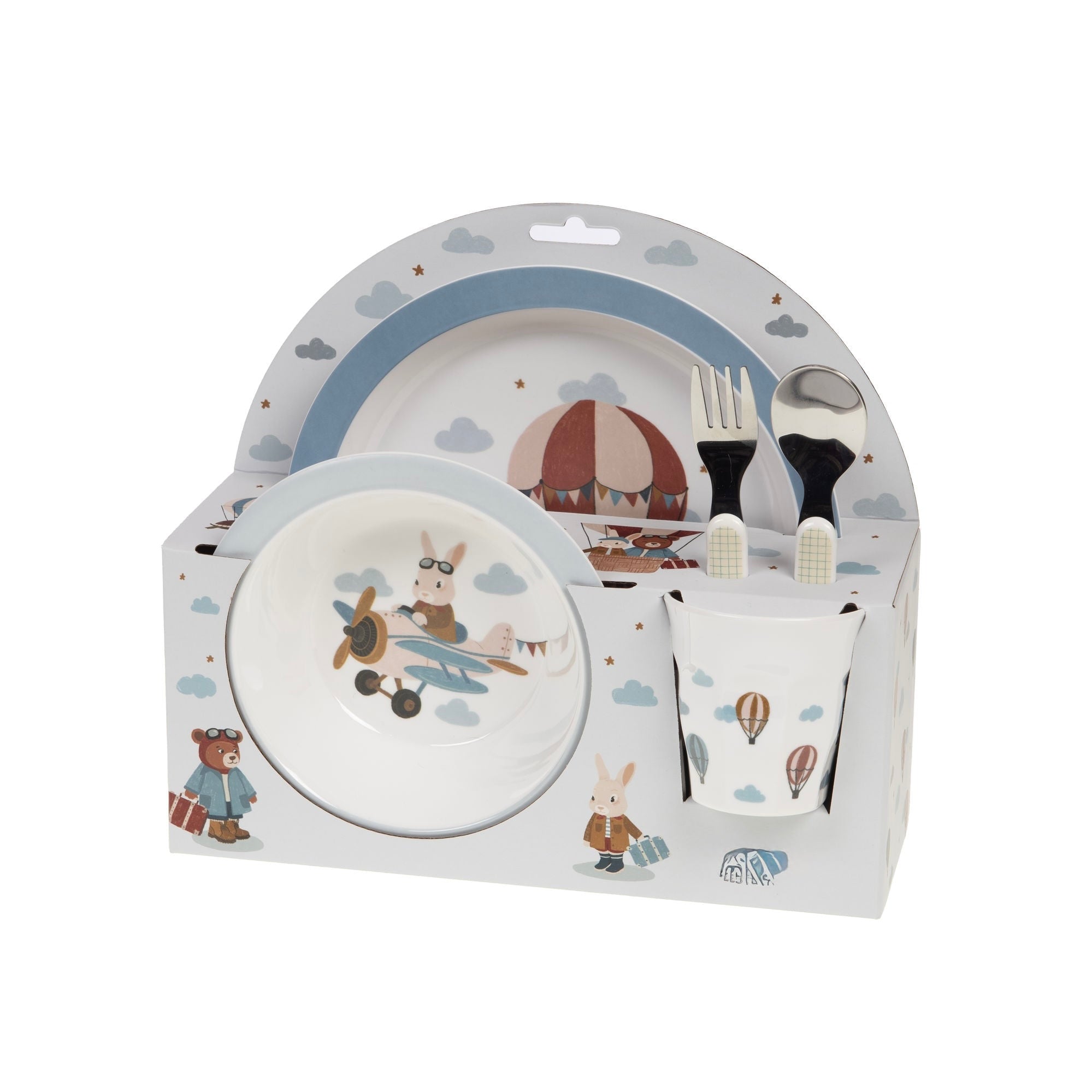 El set de comida infantil de 5 piezas combina melamina, acero inoxidable y ABS, ideal para enriquecer una gama de artículos de comida prácticos y divertidos con un diseño infantil y motivos aéreos.