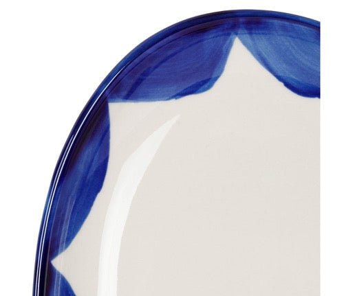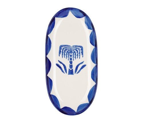 Este elegante plato de aperitivo, de forma ovalada y fabricado en gres, destaca por su acabado en blanco con detalles en azul que evocan la frescura del mar. Ideal para presentar entrantes, tapas o dulces con un toque de estilo mediterráneo, su diseño sencillo y atemporal lo convierte en una pieza versátil para el día a día o para ocasiones especiales.